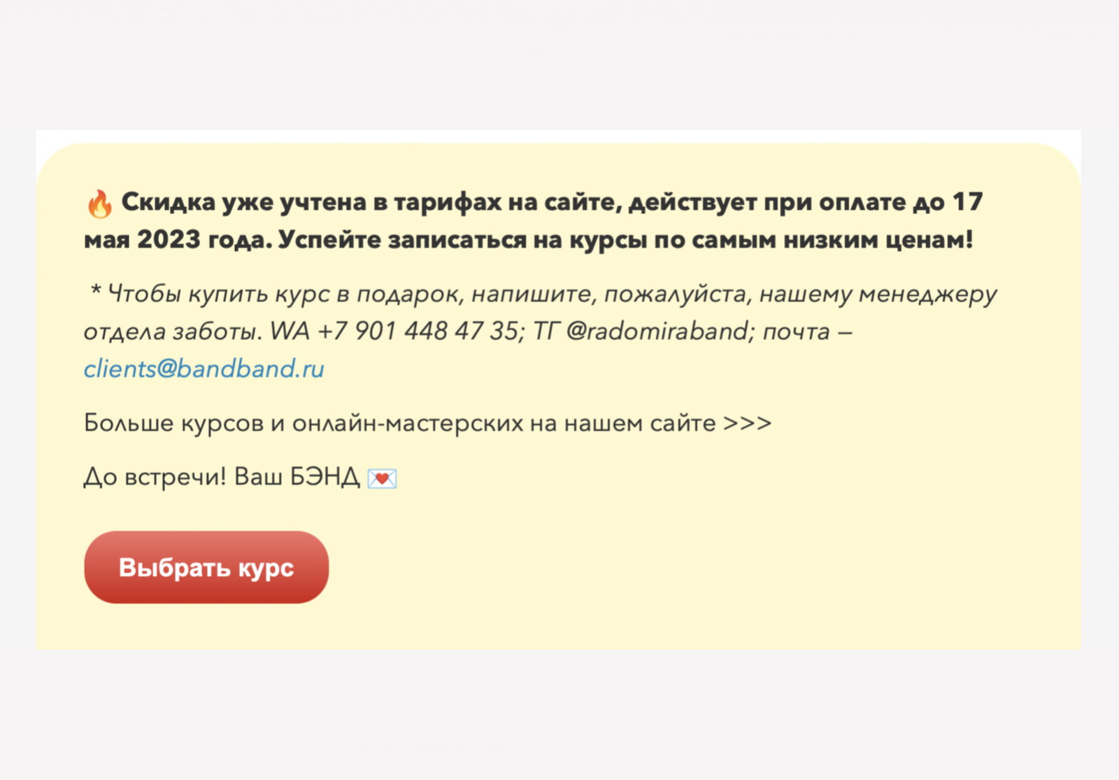 Внизу письма обязательно оставьте ссылку на отписку от рассылки и дополнительные контакты компании, куда клиент может обратиться.