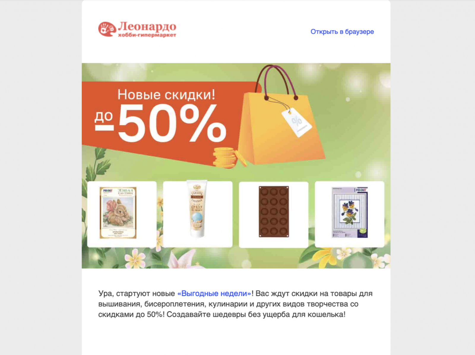 Акция от магазина товаров для творчества. Тема эмейла заманивает пользователя значительной скидкой. В письме поясняют, какие именно товары продают по сниженной цене.