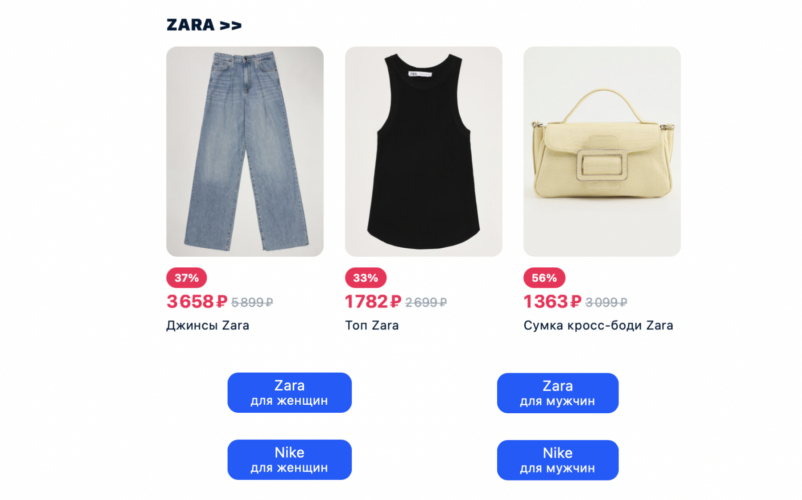 Маркетплейс предлагает купить товары известных брендов с большой скидкой. В письме — примеры конкретных предложений со скидкой и без, чтобы сразу была понятна выгода от покупки.