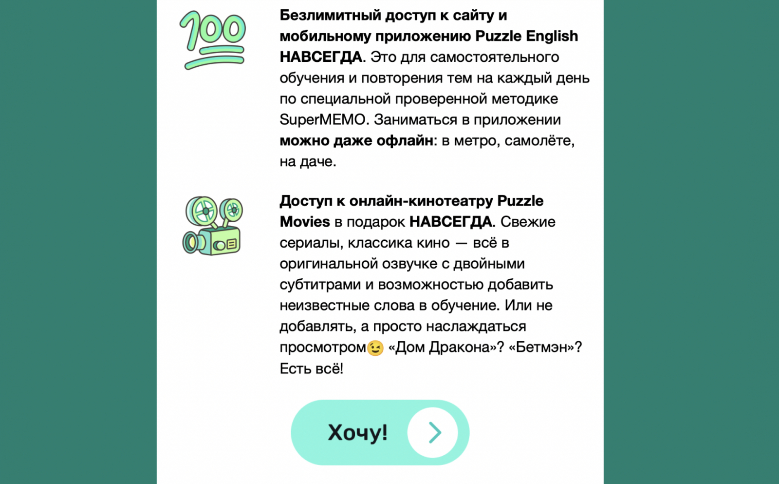 Акция для быстрых подписчиков от онлайн-сервиса изучения английского языка. Эффект срочности создаётся за счёт ограничения количества участников, которые смогут получить скидку. Предложение дополняется подарком — бессрочным доступом к нескольким сервисам платформы. Также подчёркивается уникальность скидки, получить которую можно только по ссылке из этого эмайла.