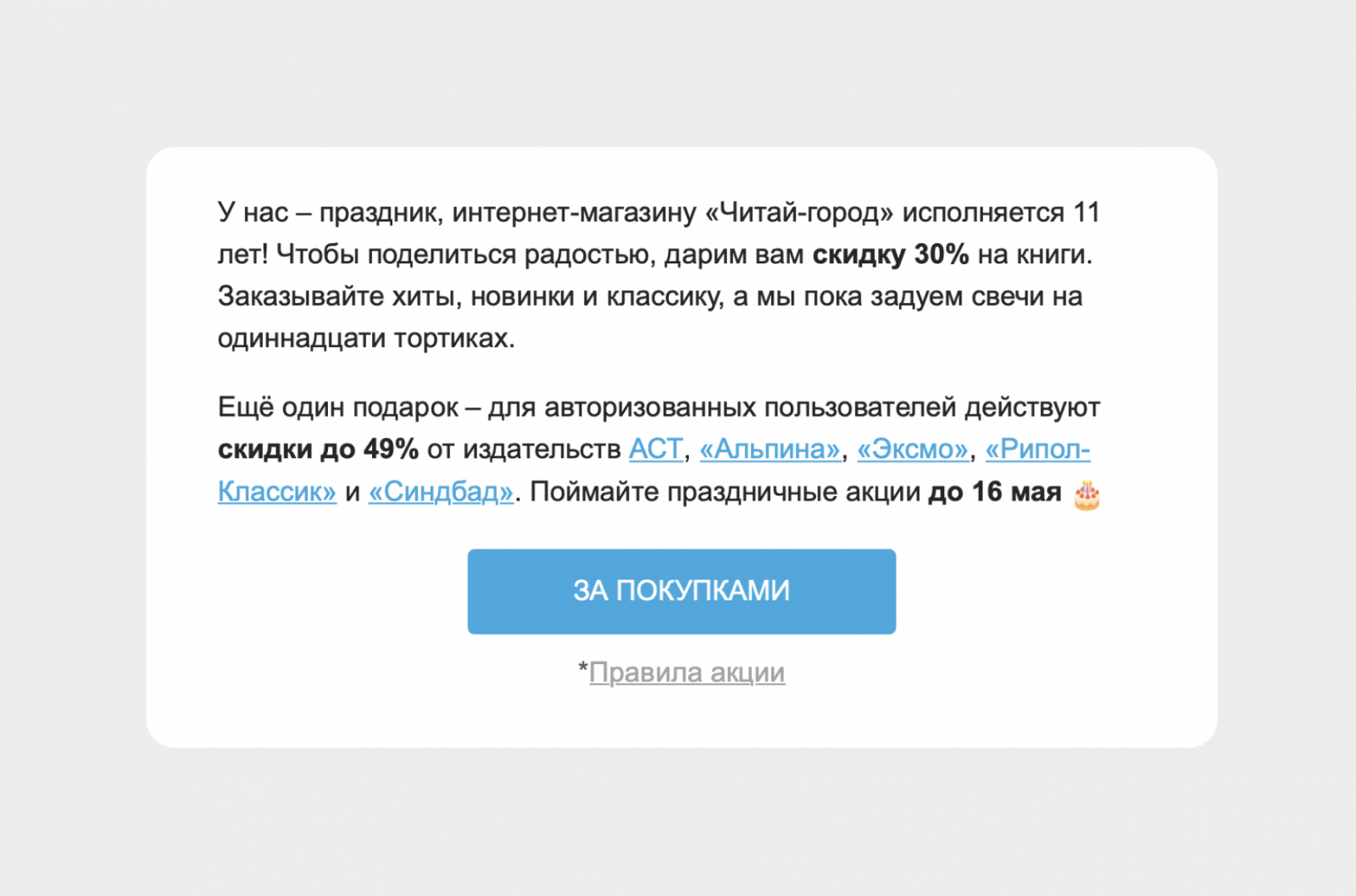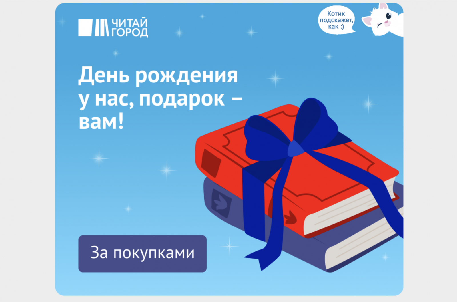 Ещё одна ситуативная акция. Книжный магазин использует свой день рождения как инфоповод для запуска распродажи.