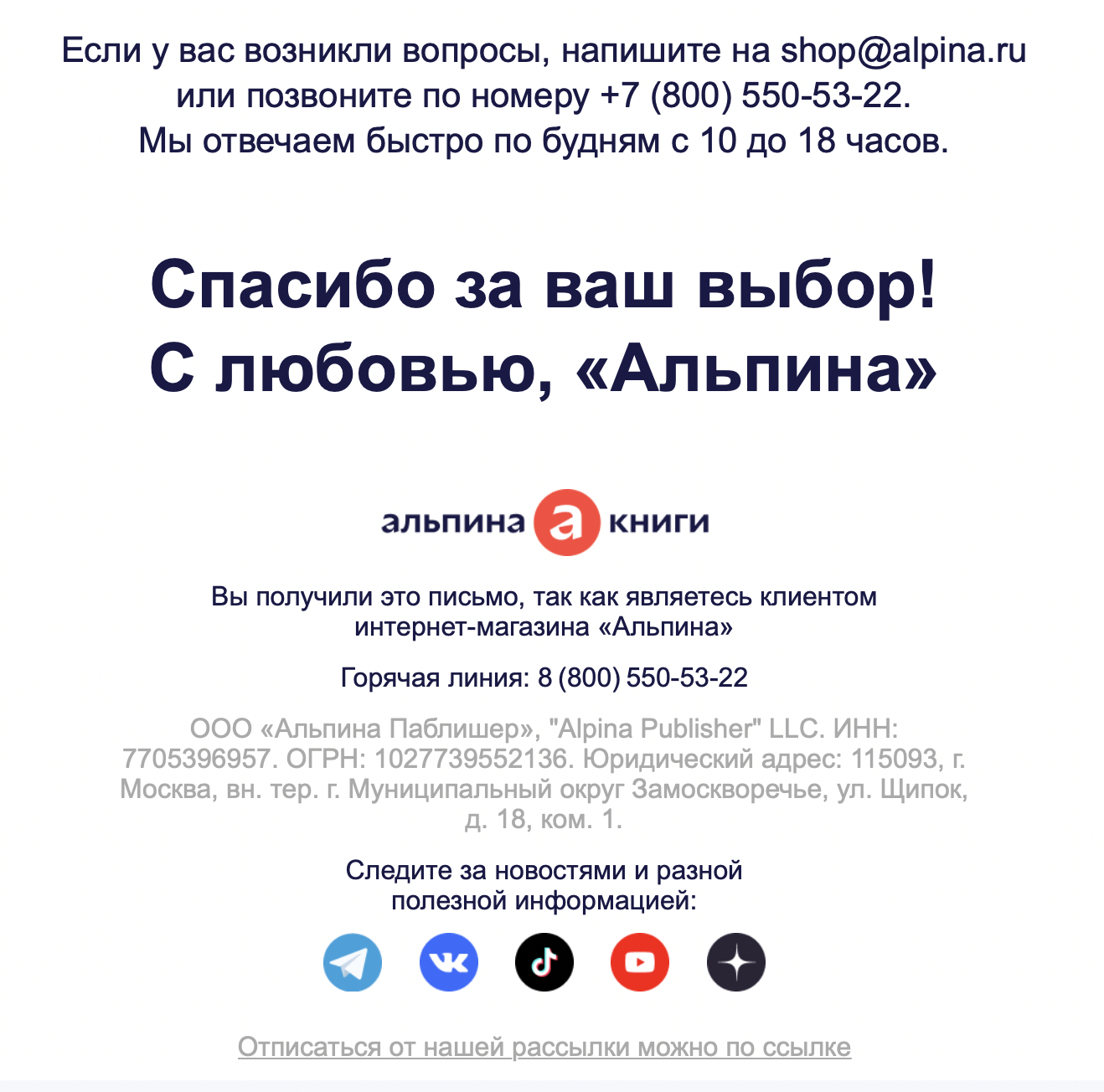 Существуют разные варианты завершения письма. Рассмотрим наиболее полную подпись в почте на примере компании «Альпина».