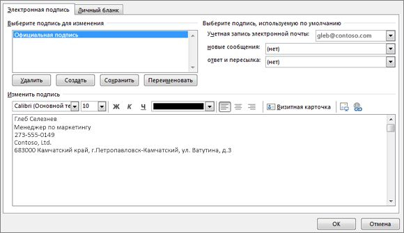 Нажмите «Создать» и добавьте в окне «Новая подпись» её название. Далее через «Изменение подписи» введите данные. Также доступны шаблоны.