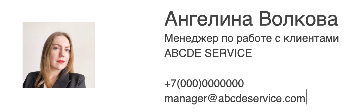 Если бренд общается от лица конкретного менеджера или нескольких людей, подпись для почты дополняется именем, должностью, прямыми контактами (если допустимо), а также фото.