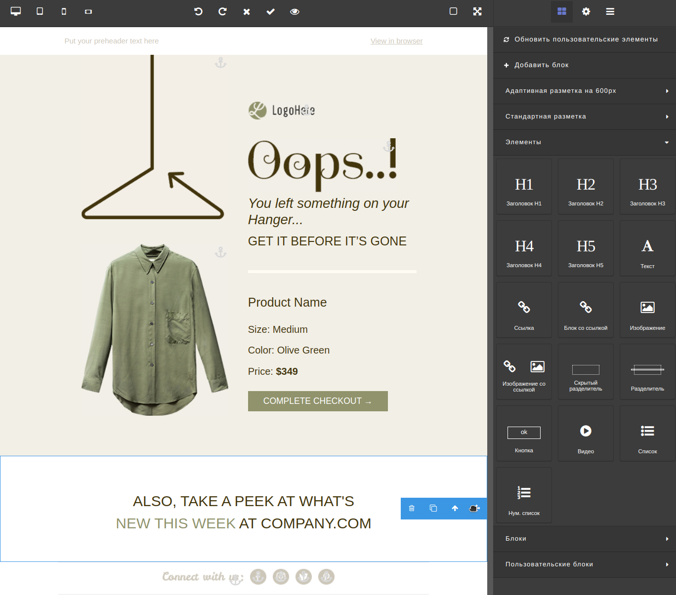 Инструмент, позволяющий перетаскивать элементы мышью, делает конструирование email-писем лёгким и интуитивно понятным. Вы просто выбираете из боковой панели элемент: изображение, цитату, кнопку, —и перетаскиваете его в нужное место в письме.