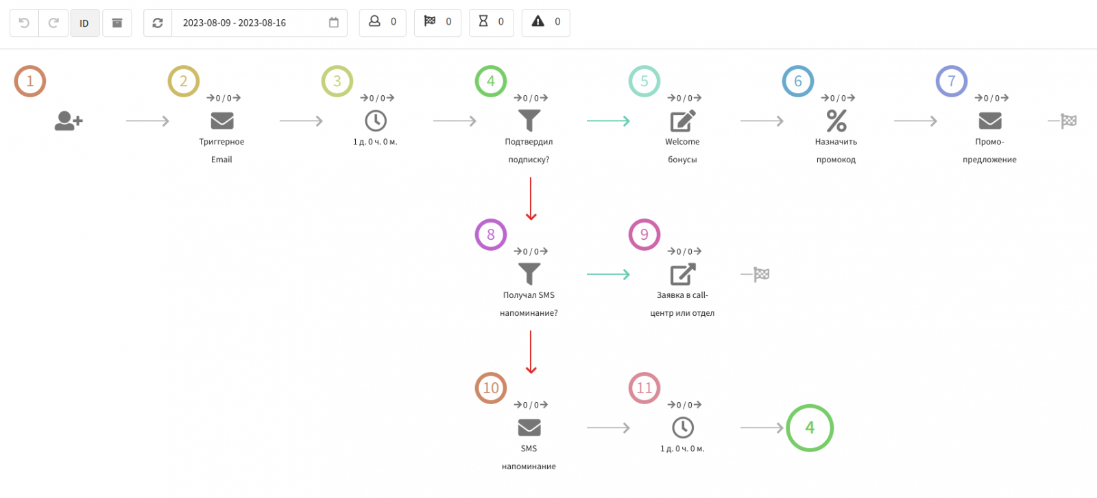 Допустим, у вас есть контентное предложение и вы хотите отправить цепочку писем потенциальным клиентам. Через инструмент автоматизации вы предварительно выберите, какие именно письма будут отправляться, в каком порядке и через какое время.