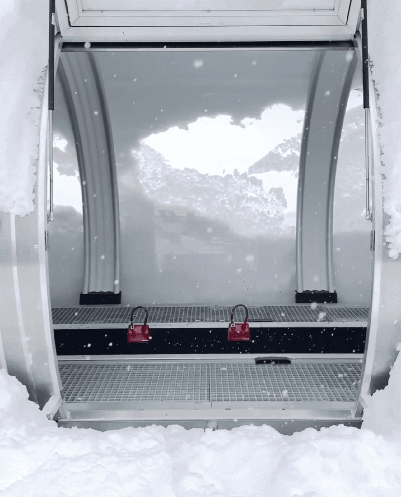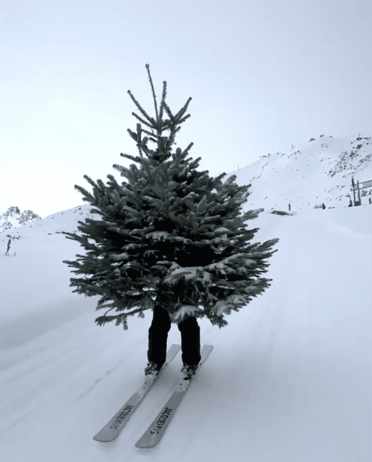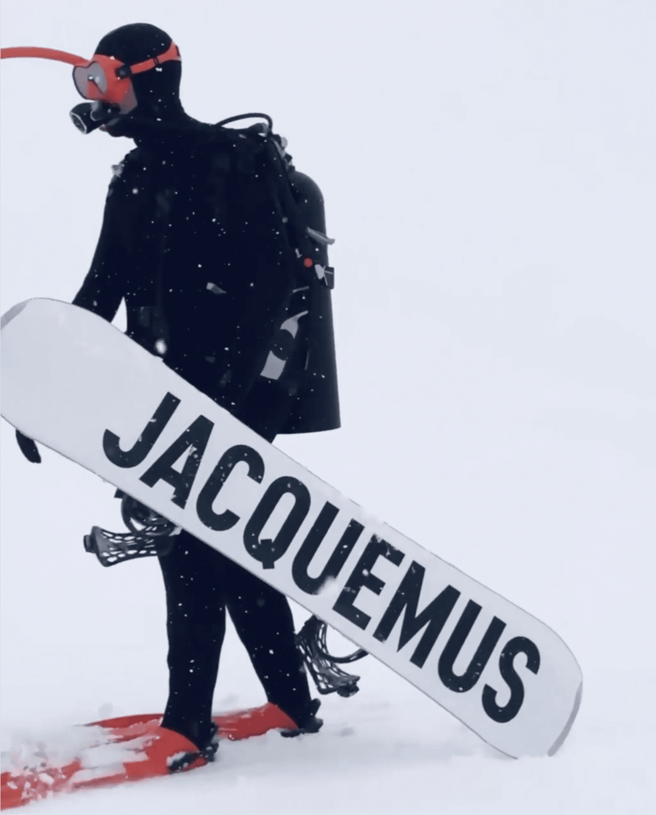 Но бренд не остановился и в декабре выпустили серию CGI видео, которые рекламируют открытие магазинов на горном курорте Куршавель. Лого Jacquemus появляется на кабинках подъёмников, на сноуборде, который несёт водолаз. А ещё с горы на лыжах спускается настоящая ёлка с человеческими ногами.