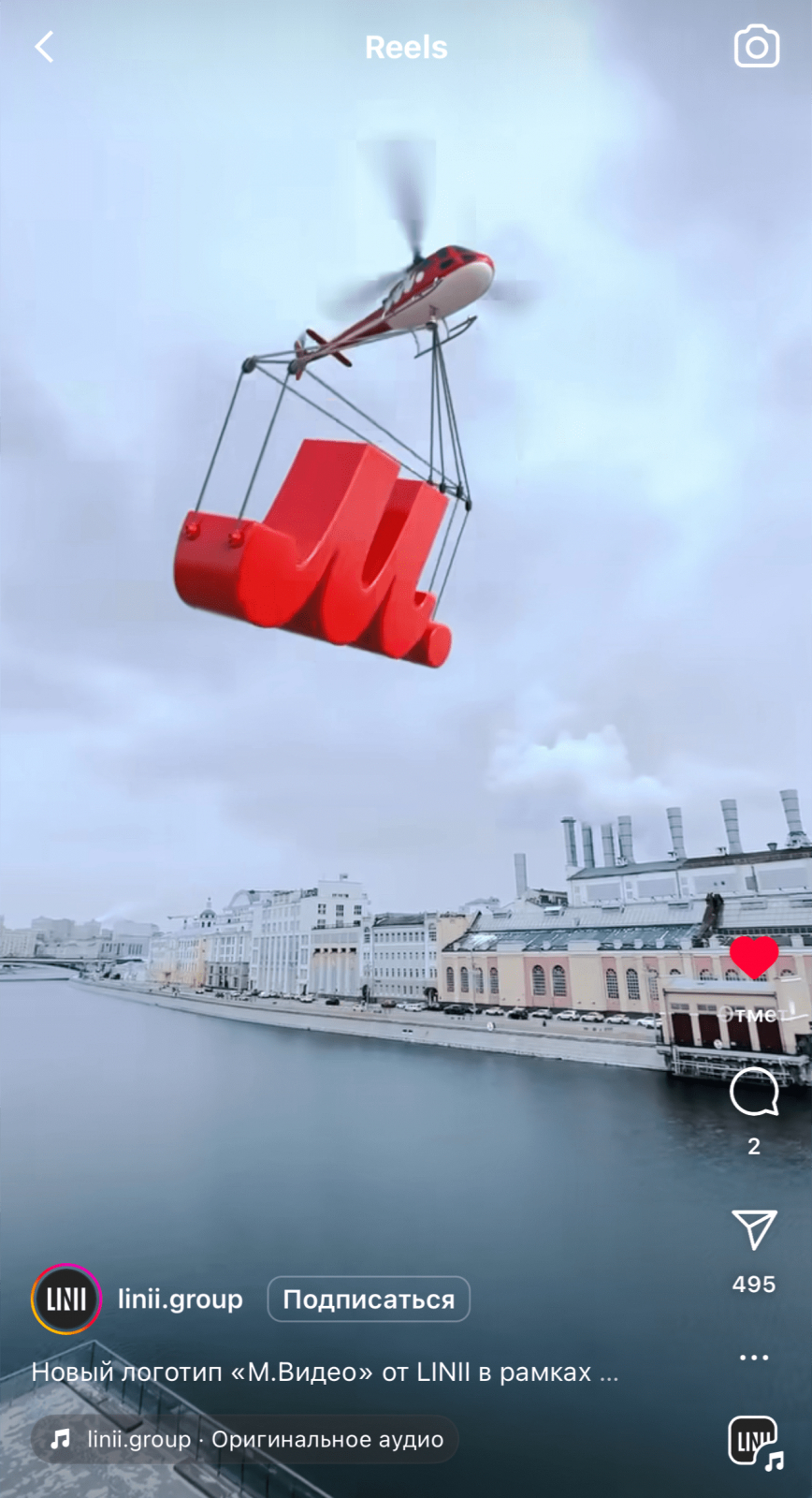 Брендинговое агентство Linii наглядно и эффектно показало новый лого компании «М.Видео». Новый объёмный символ бренда проносит над рекой в Москве вертолёт. Мимо проходят люди, которые как бы фотографируют его.
