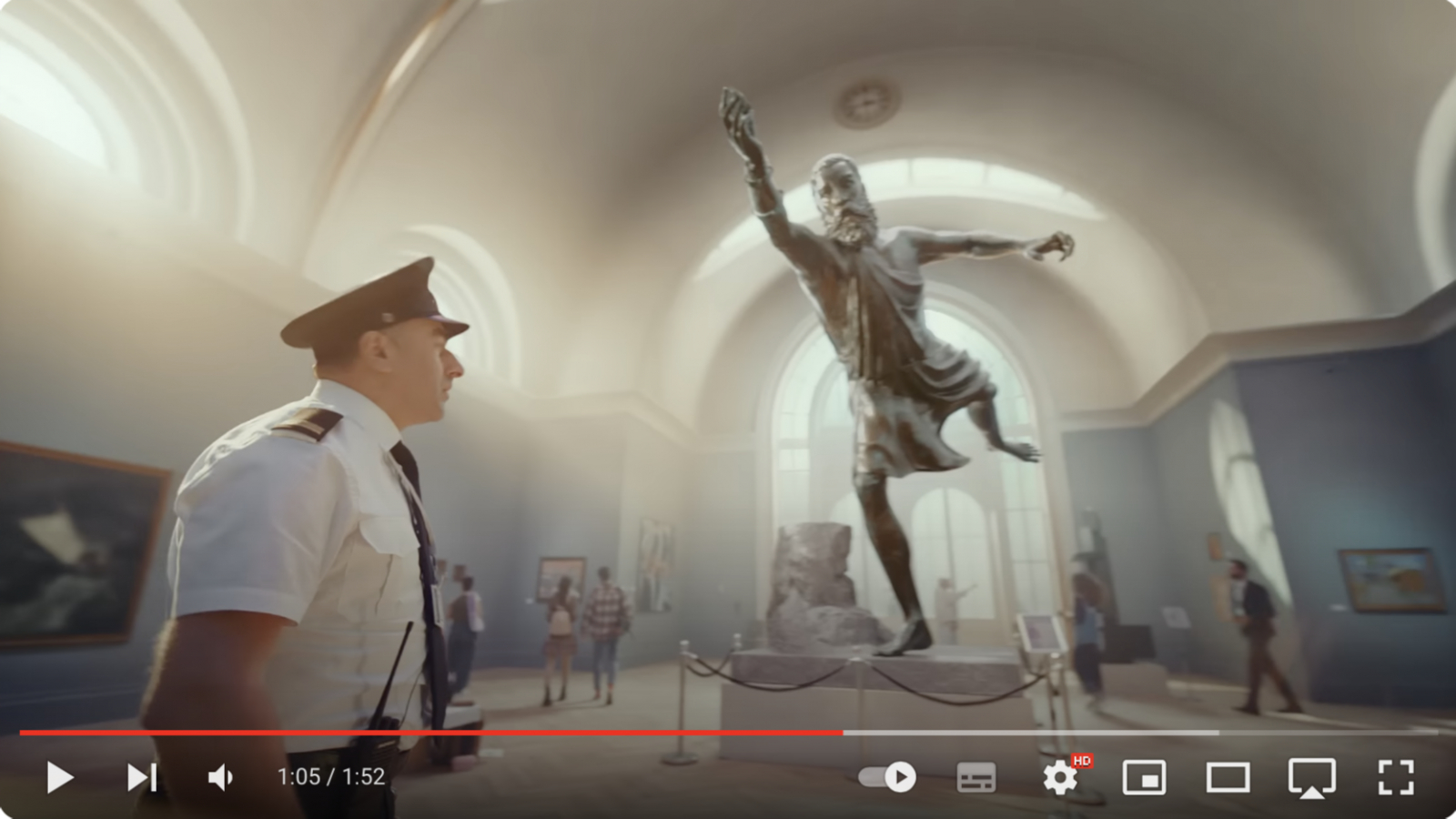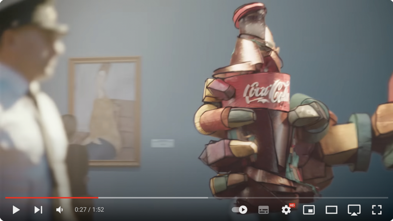 В ролике от Coca Cola в музее оживают произведения искусства, а вокруг ходят посетители. Конечно, это происходит ради того, чтобы передать друг другу ту самую бутылку газировки. При этом действия экспонатов остаются незаметными для людей в зале.