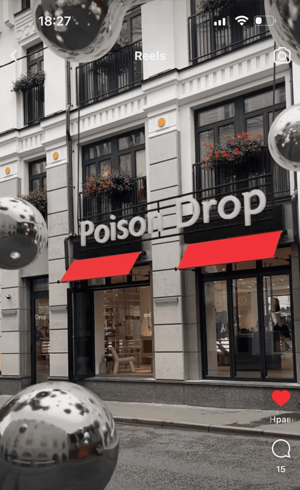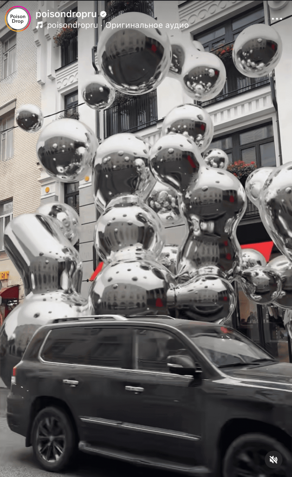 Бренд украшений сообщил в своём аккаунте Instagram* об открытии нового магазина на Патриарших прудах в Москве CGI роликом. Сначала на улице появляются огромные серебристые капельки, которые растворяются, а на здании за ними опускается вывеска Poison Drop. При этом в видео ездят машины, и слышно шум улицы, что добавляет реалистичности.