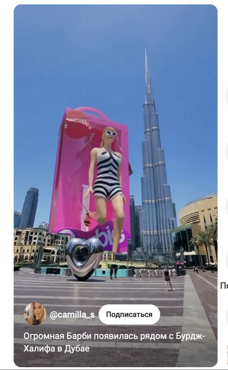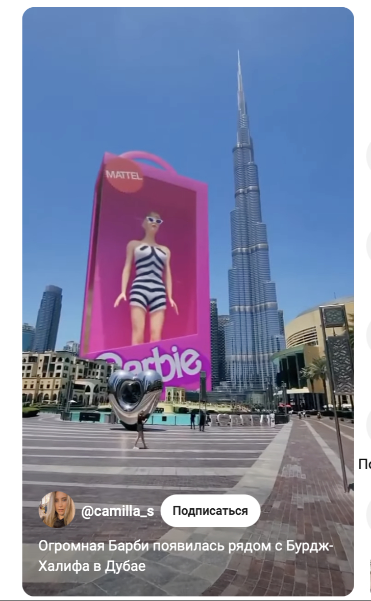 Рекламная кампания фильма «Барби» дополнилась огромной куклой, которая выходит из своей коробки в Дубае недалеко от небоскреба Бурдж-Халифа. Хотя в самом фильме было много реальных декораций, такое появление Барби только усилило интерес к проекту.