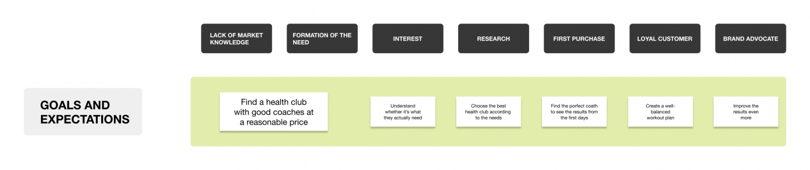 Например, вот такие могут быть цели и ожидания клиентов фитнес-клуба на разных этапах пути клиента: