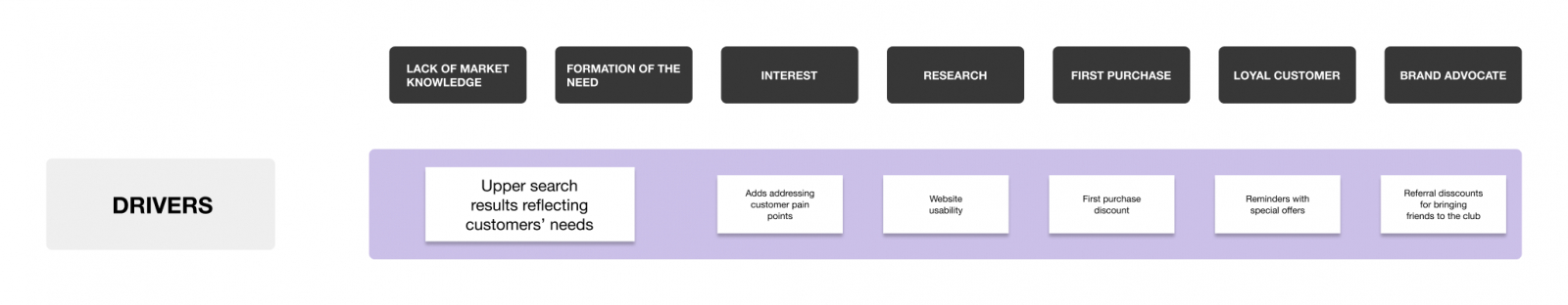 Движущие силы помогают людям перейти на следующий этап карты пути клиента: скидки, отзывы клиентов, бонусы и так далее. Они могут быть разными в зависимости от целей клиентов на каждой ступени: например, если человек хочет сэкономить деньги, основной движущей силой будет стоимость. А если человек хочет влиться в сообщество, тогда закрытые клубные мероприятия для участников союза сработают в нужном направлении. Чтобы понять, что важно для клиентов, рассылайте email-опросы, SMS, пуш-уведомления, используйте соцсети и другие инструменты, которые помогут собрать отзывы клиентов.