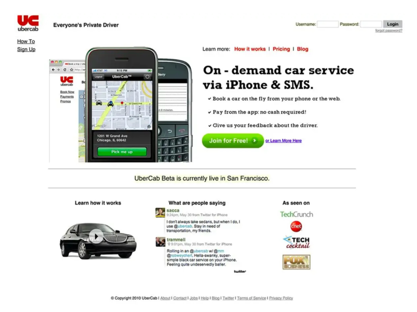 В первой версии сервис назывался Ubercab. Минимально жизнеспособный продукт включал только функцию связи пассажира и водителя, который находится поблизости в режиме реального времени. Уже тогда была система рейтинга водителей и GPS.