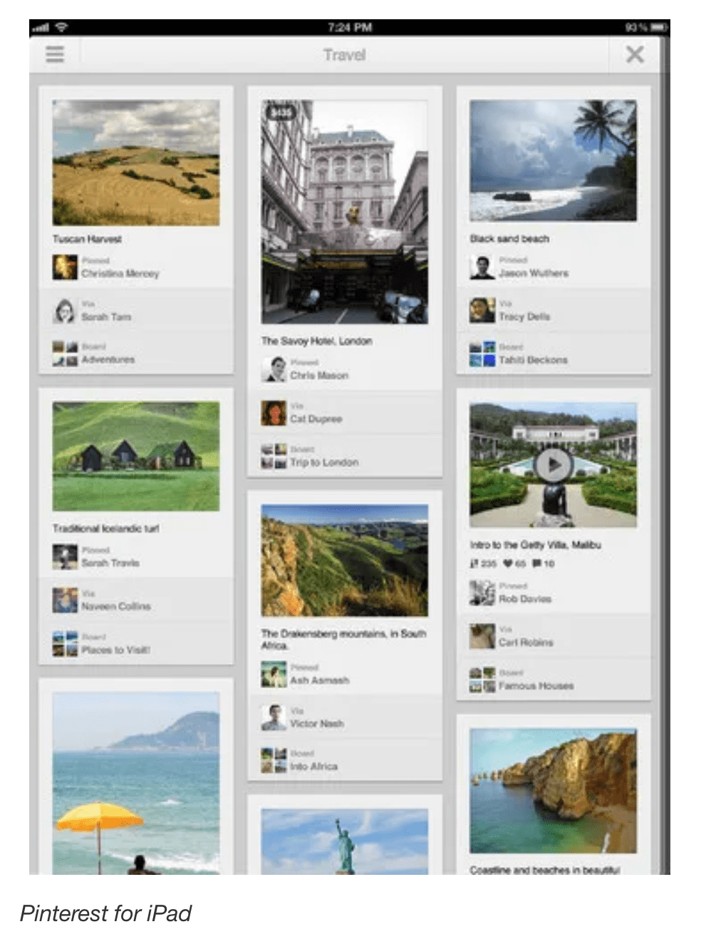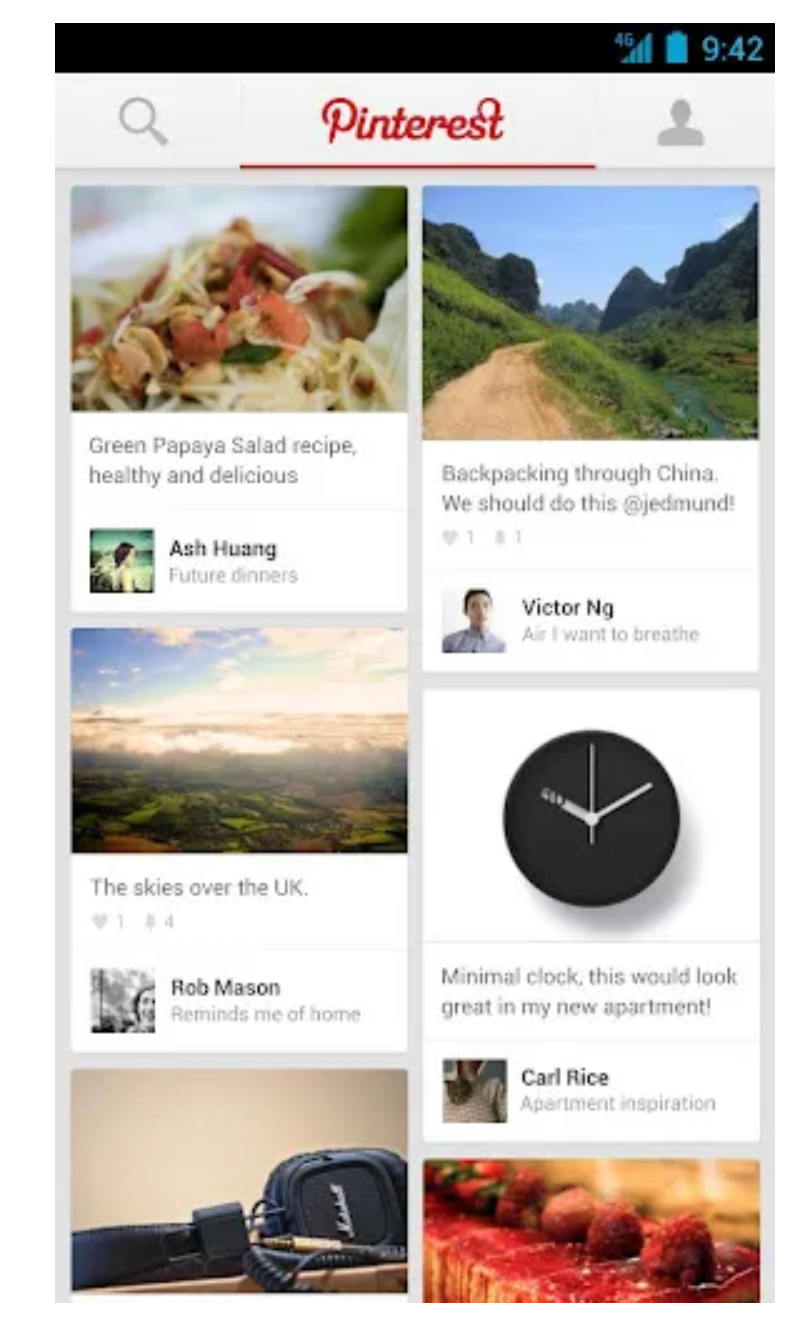 MVP сервиса было максимально простым: пользователи сохраняли идеи (картинки) по темам и размещали их на досках (пинбордах) и делились ими с другими. Сегодня эта сторона Pinterest осталась, но появился также поиск, лента рекомендаций и общий доступ к доскам, также на платформе возможно выкладывать видео.