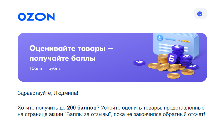 Запустить маркетинговые кампании как методы удержания клиентов. О вас напомнит email рассылка, Push уведомления, отправка сообщений в мессенджеры и по SMS. Для возвращения пользователя к покупкам и другим целевым действиям используют спецпредложения, акции, также хорошо работает персонализация. Полезно для удержания давать клиентам бонусы за разные активности, которые работают также на ваш бренд. Например, Ozon дарит бонусы за отзывы с фото и видео.