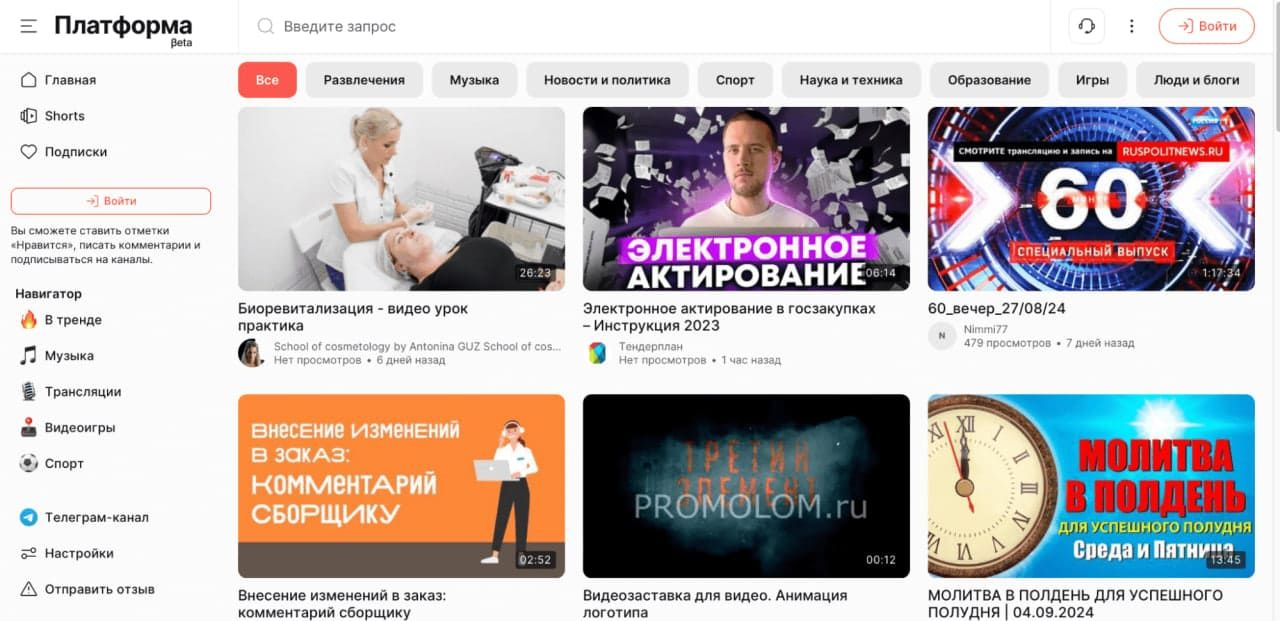 В конце июня 2024 года российская компания Rteam анонсировала запуск бета-версии сервиса «Платформа». Визуально — это полный аналог ютуба. Разработчики сразу заявили, что это альтернатива зарубежной площадки, и здесь сохраняются такие же функции. Доступна загрузка видео в 4К, горизонтальные и короткие вертикальные SHORTS-ролики. Замена ютуба предлагает рекомендации, встроенные субтитры, статистику для анализа контента, что важно для видеомаркетинга.