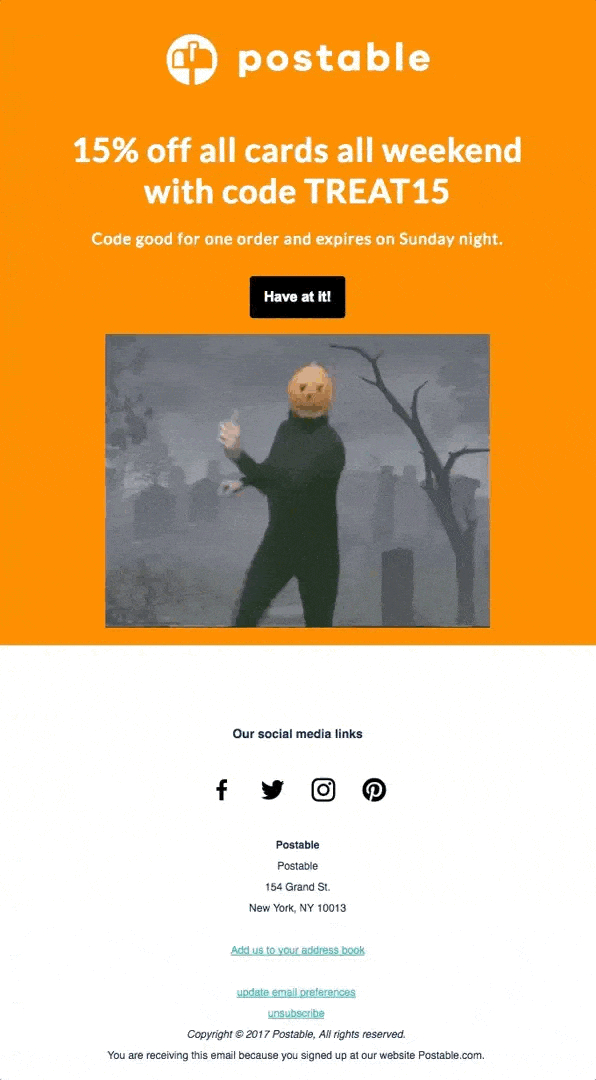 1. Вариант с GIF и скидкой. Посмотрите, как креативщики из Postable оживили свое хэллоуинское письмо забавной GIF-кой. Такой подход не только приковывает взгляд, но и создает праздничную атмосферу. А скидка 15% с тематическим кодом (TREAT — «угощение») становится приятным бонусом для подписчиков.