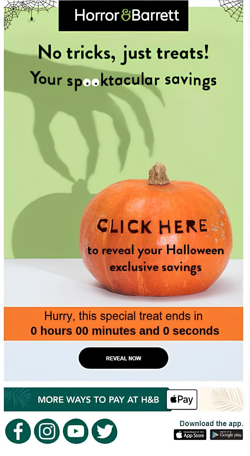 - Здесь используется стилизованный шрифт в духе праздника. В таких емейлах можно попробовать буквы с эффектом размытости, «капель крови» или «царапин» для заголовков и подзаголовков. Однако важно не перегружать письмо и убедиться, что текст остаётся читабельным. Такие шрифты должны быть использованы умеренно — только для выделения ключевых фраз или заголовков.