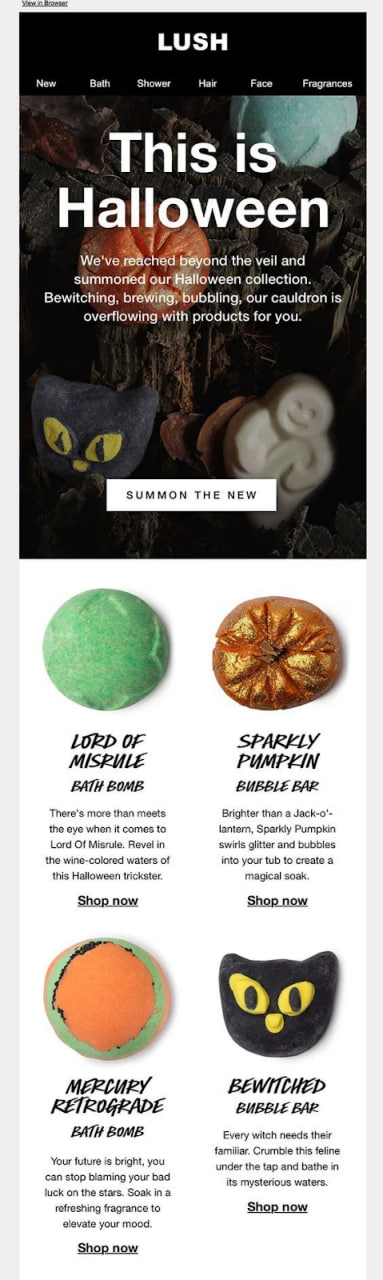 - Вместо того чтобы предлагать скидки или промоакции, Lush ставит свою продукцию на первый план. Бренд предлагает своим подписчикам коллекцию косметики, идеально подходящей для этого праздника — бомбы для ванн с тематическим оформлением и ароматами. Такой подход позволяет акцентировать внимание на уникальности продукта, а не на его цене.