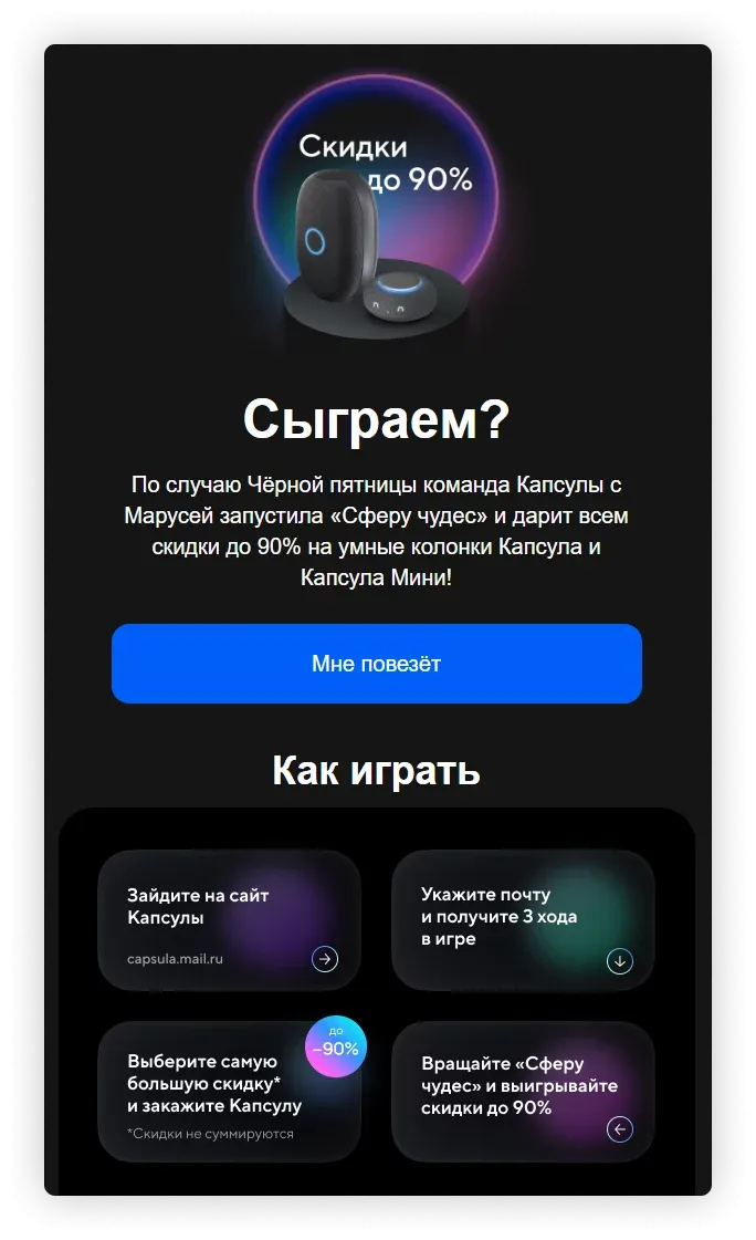 Геймификация. Включите в рассылку возможность выиграть подарочный купон. Это может быть простая игра, например, «поймай скидку». Пользователи будут «искать» бонусы в вашем письме, на сайте или в приложении. Каждый, кто их найдёт, получит приз.