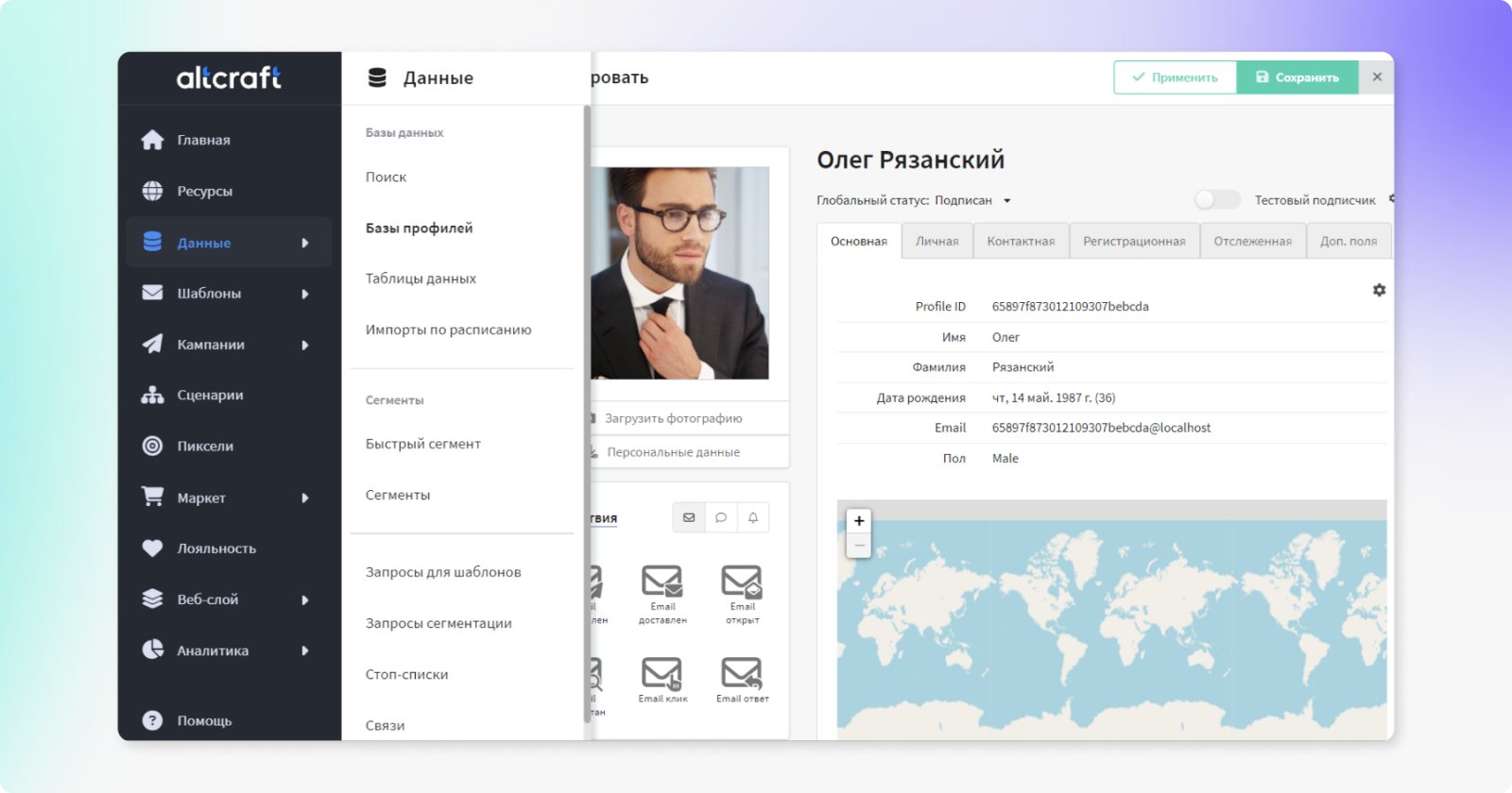 Сбор, аналитика и управление клиентскими данными. Платформа позволяет собирать, анализировать и управлять клиентскими данными в едином интерфейсе, обеспечивая высокий уровень безопасности и защиты. В профиле пользователя аккумулируется подробная информация о его действиях из различных источников. Точность и объем данных позволяют проводить детальную сегментацию аудитории для более эффективного взаимодействия.
