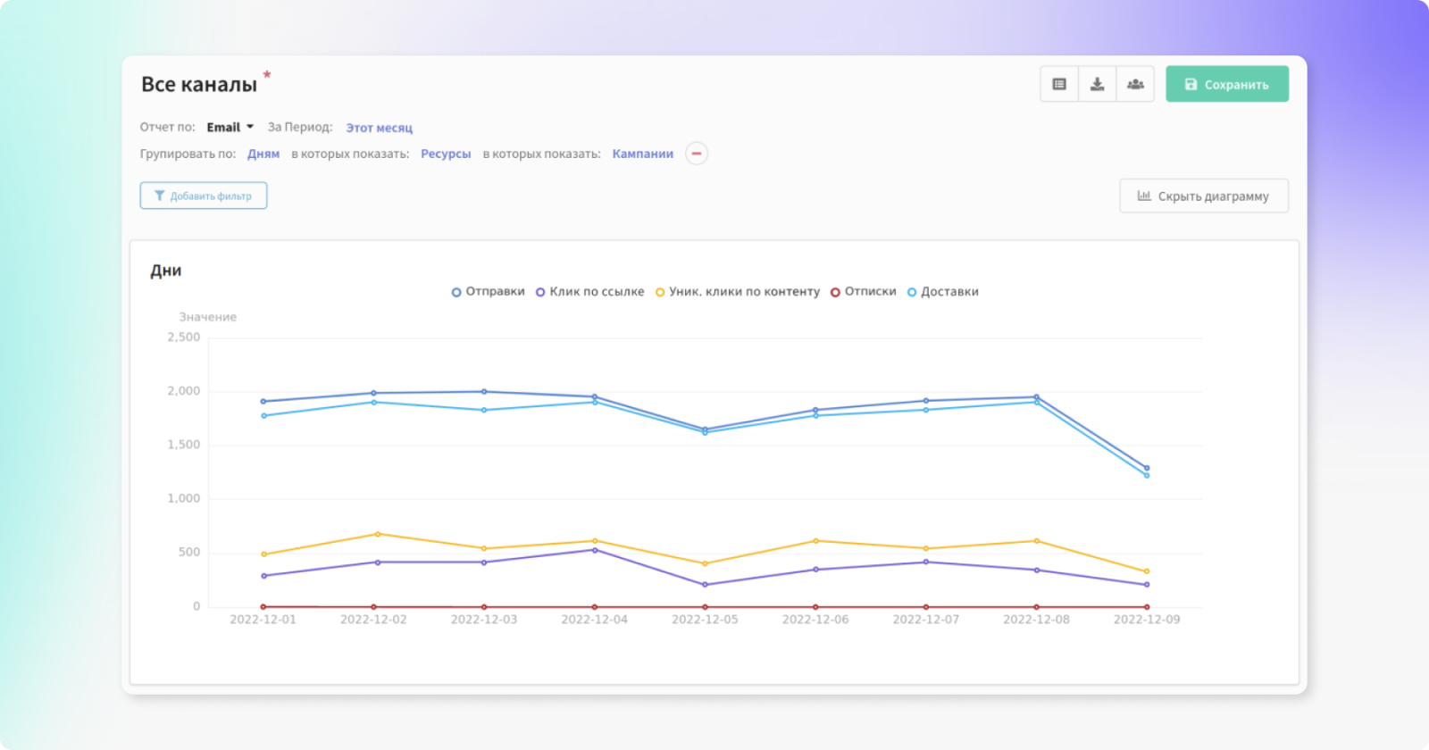 Платформа поддерживает все виды рассылок, включая сложные email-цепочки и полностью автоматизированные рекламные кампании.