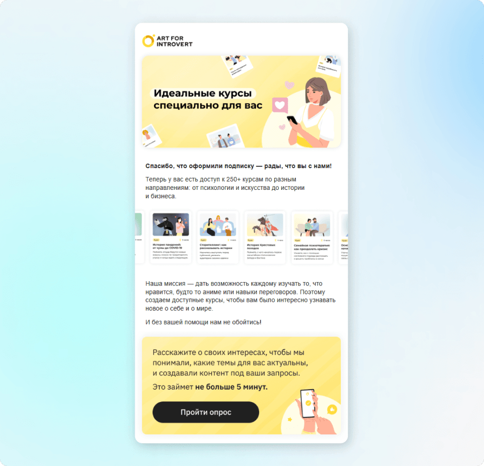 Главная задача такой рассылки — привлечь внимание читателя и вызвать интерес к продуктам компании. Она автоматически отправляется после подписки через веб-форму, регистрации на сайте или загрузки бесплатного материала, доступного по подписке.
