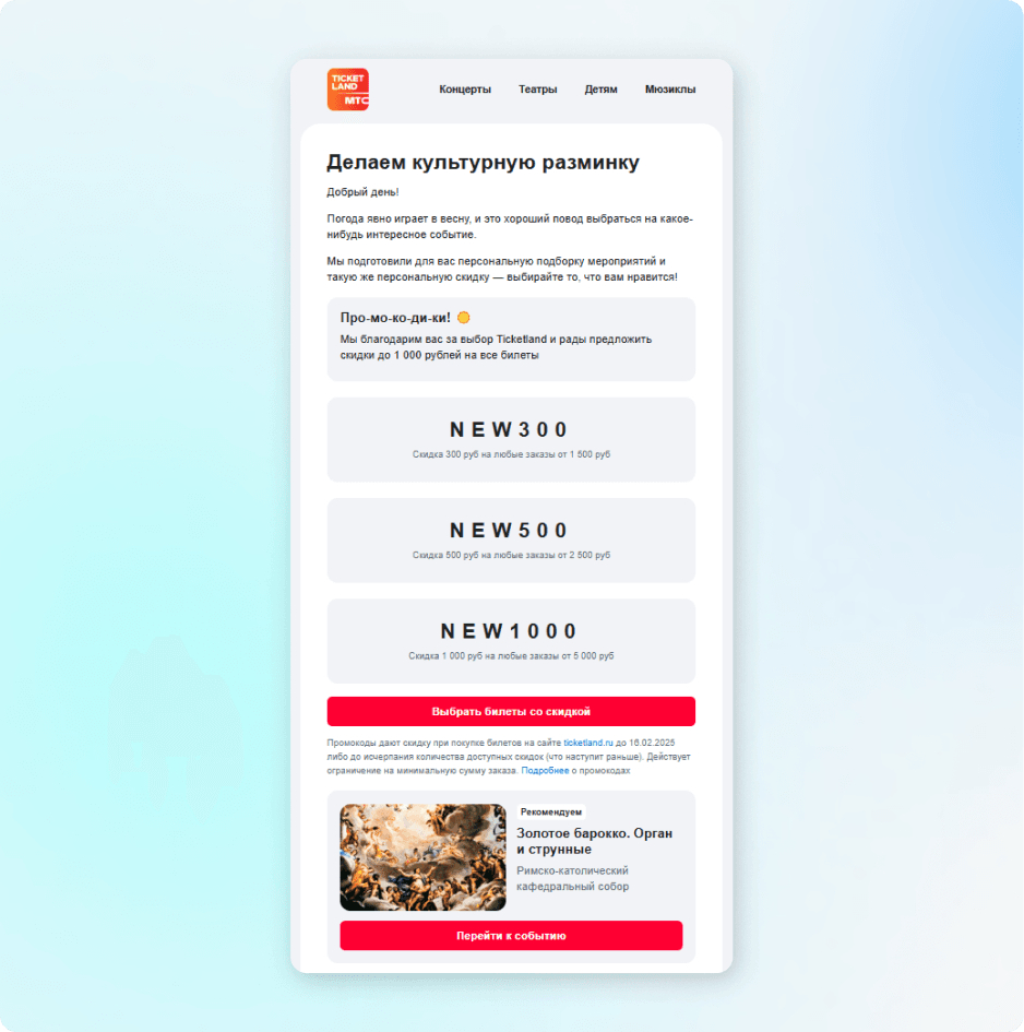 Поздравительные письма. Обычно вместе с поздравлениями и пожеланиями подписчикам предоставляется определенная выгода, например, скидка на продукцию компании.