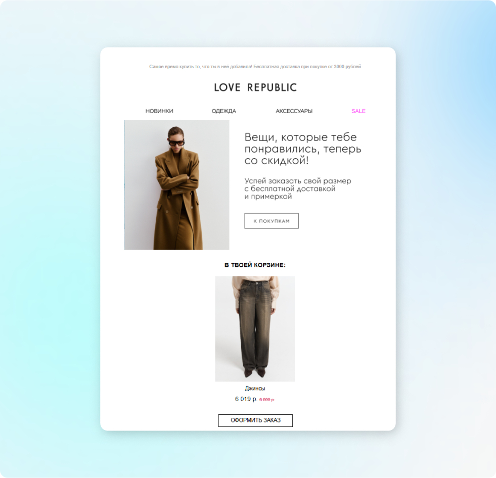 Благодаря триггерной рассылке покупатель вспомнит о своём заказе и с высокой вероятностью его завершит. Это помогает бизнесу возвращать клиентов и увеличивать конверсию без дополнительных затрат на рекламу.