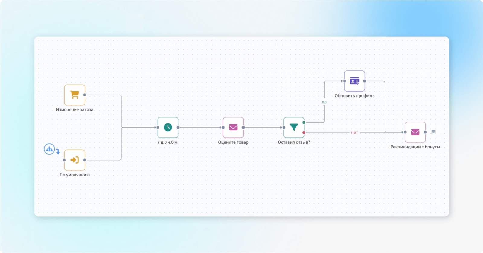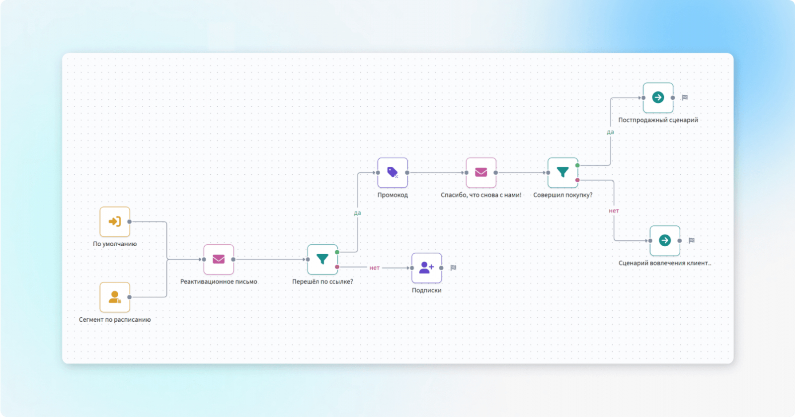 Отправка одного триггерного письма — это уже эффективный способ взаимодействия с клиентом. Но коммуникация может быть более сложной и продуманной. Вместо единичного письма можно запустить целую цепочку действий: отправить серию сообщений, назначить персональный промокод, сегментировать аудиторию по её реакции. Разберёмся, как работают самые популярные триггерные цепочки.