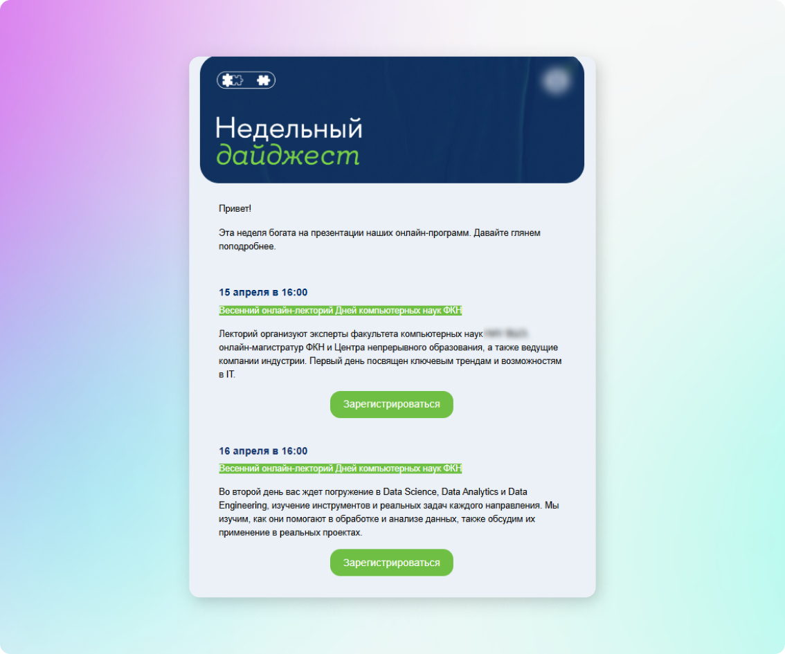 Чёткий, выделенный и единыйпризыв к действиюделает письмо управляемым — пользователь быстро ориентируется и понимает следующий шаг. Это может быть «Скачать чек-лист», «Купить со скидкой», «Записаться на вебинар» — главное, чтобы CTA был конкретным, лаконичным и визуально заметным.