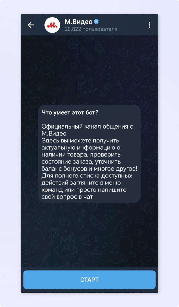 Ещё один вариант — чат-боты в Telegram. Подписавшись на бота, клиент может получать уведомления о доставке, напоминания, новости и даже коды подтверждения. Важно, что инициатива здесь исходит от клиента: бот получает право отправлять сообщения только после нажатия кнопки «Старт».
