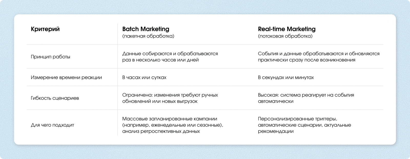 При классической «пакетной» обработке данных (Batch Marketing) события собирают за период в несколько часов или дней. Затем их выгружают из CRM или аналитической системы, обрабатывают и добавляют в рекламные кабинеты или системы рассылок. Только после этого запускается кампания.