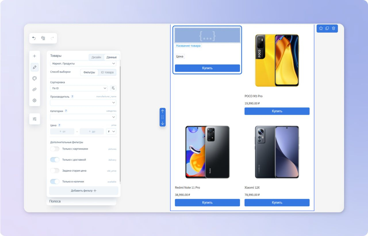Перетащите элемент в шаблон и настройте дизайн. Затем с помощью фильтра выберите, какие товары должны отображаться в письме. Доступны фильтры по категориям, ценовому диапазону, наличию товара на складе и любым другим параметрам Маркета. Всё делается в визуальном режиме, без кода и SQL-запросов.