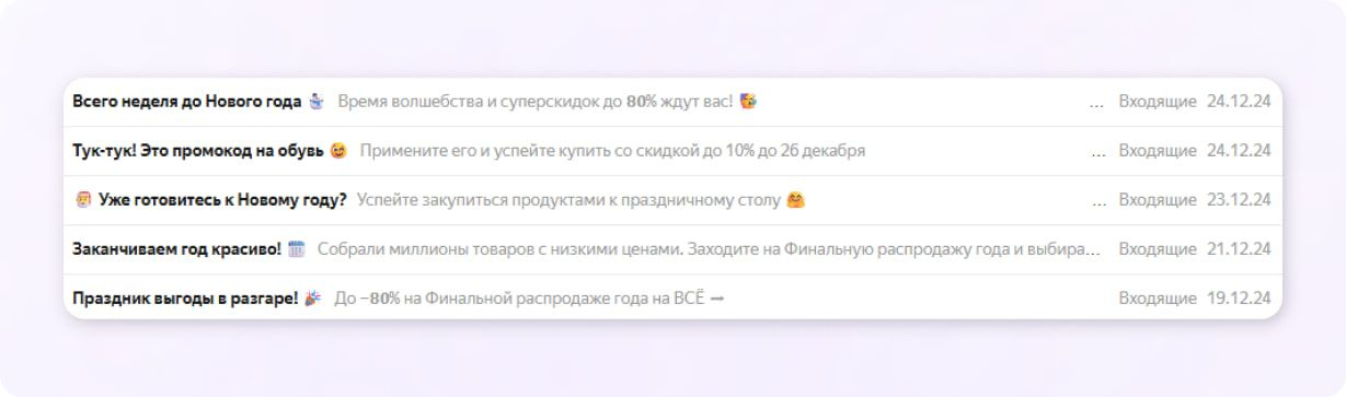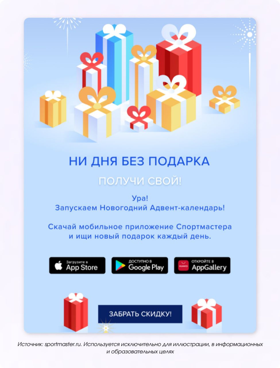 Ещё хороший формат — адвент-календарь. Это серия писем или мини-лотерея с сюрпризами на каждый день. Все сообщения приносят что-то новое: промокод, полезный совет, забавное задание или мини-игру. Акция превращается в привычку: человек открывает письма ежедневно, ожидая следующий подарок.