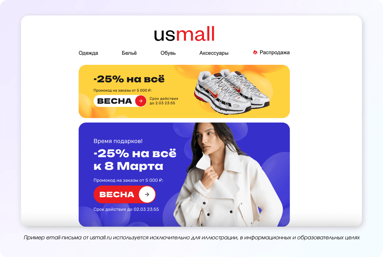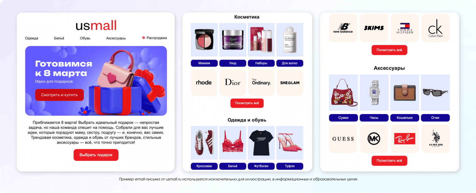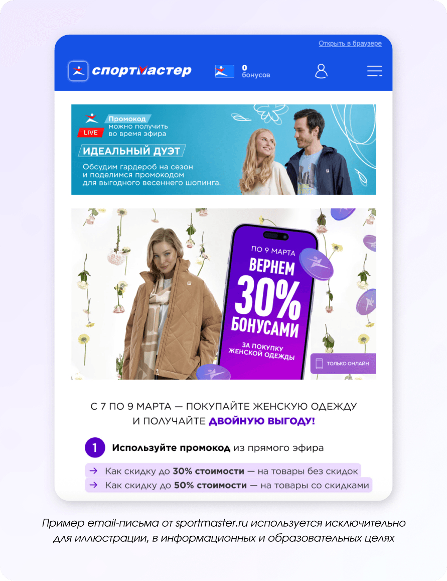 Ещё одна важная часть праздника — внешний вид и настроение, которое создаёт образ. Поэтому брендам одежды, обуви и аксессуаров логично делать отдельные рассылки для женской аудитории с готовыми идеями нарядов и подборками к случаю.