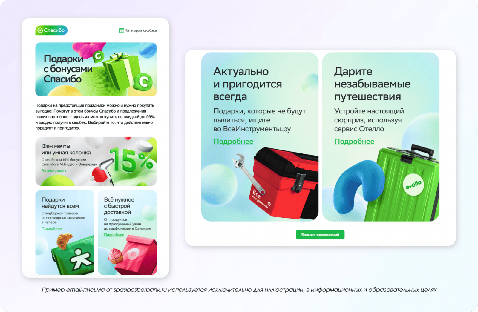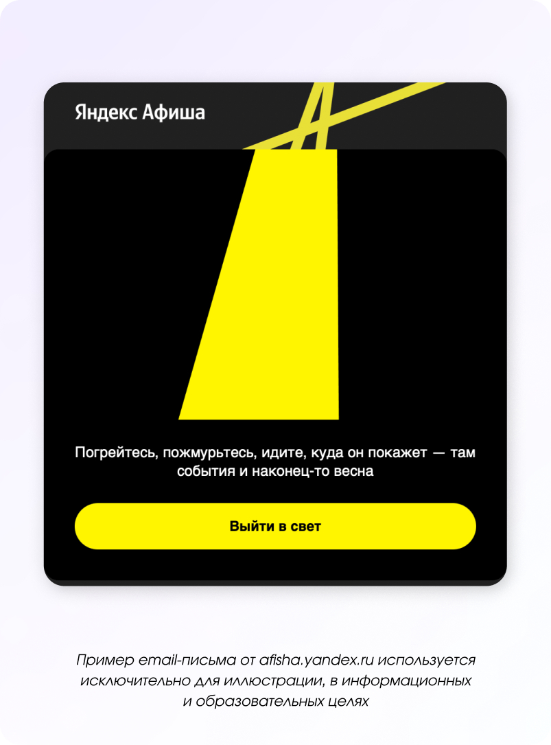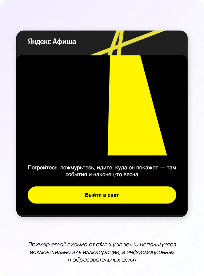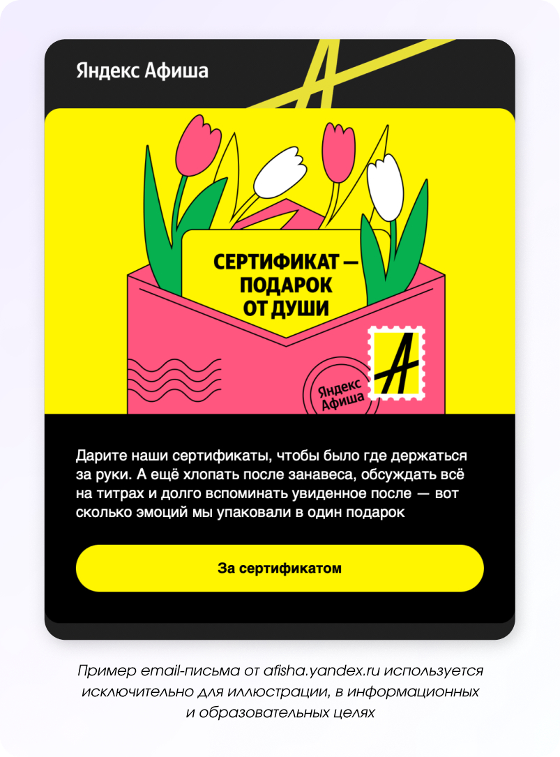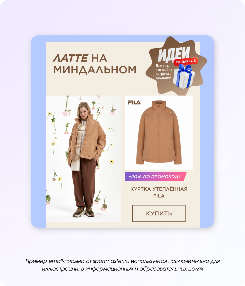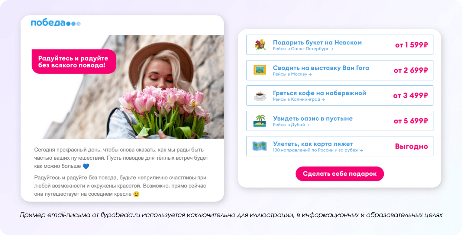 Праздник — это не только про подарки, но и про впечатления, совместный отдых и атмосферу. Поэтому в рассылках можно не продавать напрямую, а подсказывать идеи: куда сходить, где провести время или как устроить небольшой праздник для себя и близких.