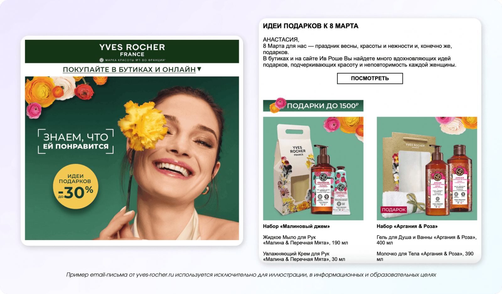 Косметический бренд предлагает готовые наборы для подарка. В письме используется персонализация: пользователя называют по имени, а также учитывают обычную сумму покупок. Идеи предлагаются именно под такой бюджет.