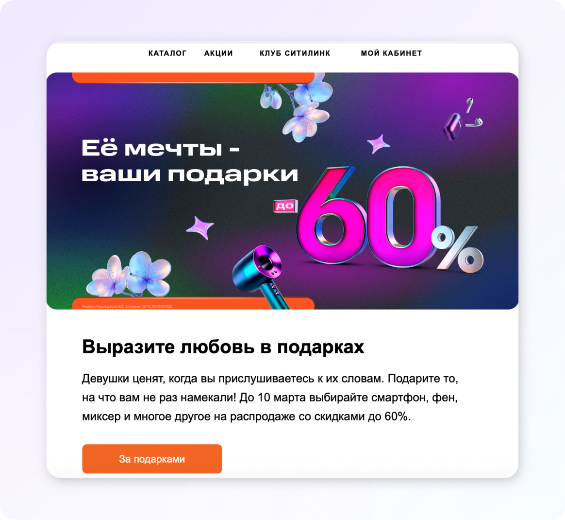 К 8 марта хорошо работают рассылки с напоминаниями о подарках для любимых женщин. Такие сообщения вовремя подталкивают к покупке и упрощают выбор, особенно для тех, кто откладывает решение до последнего момента.