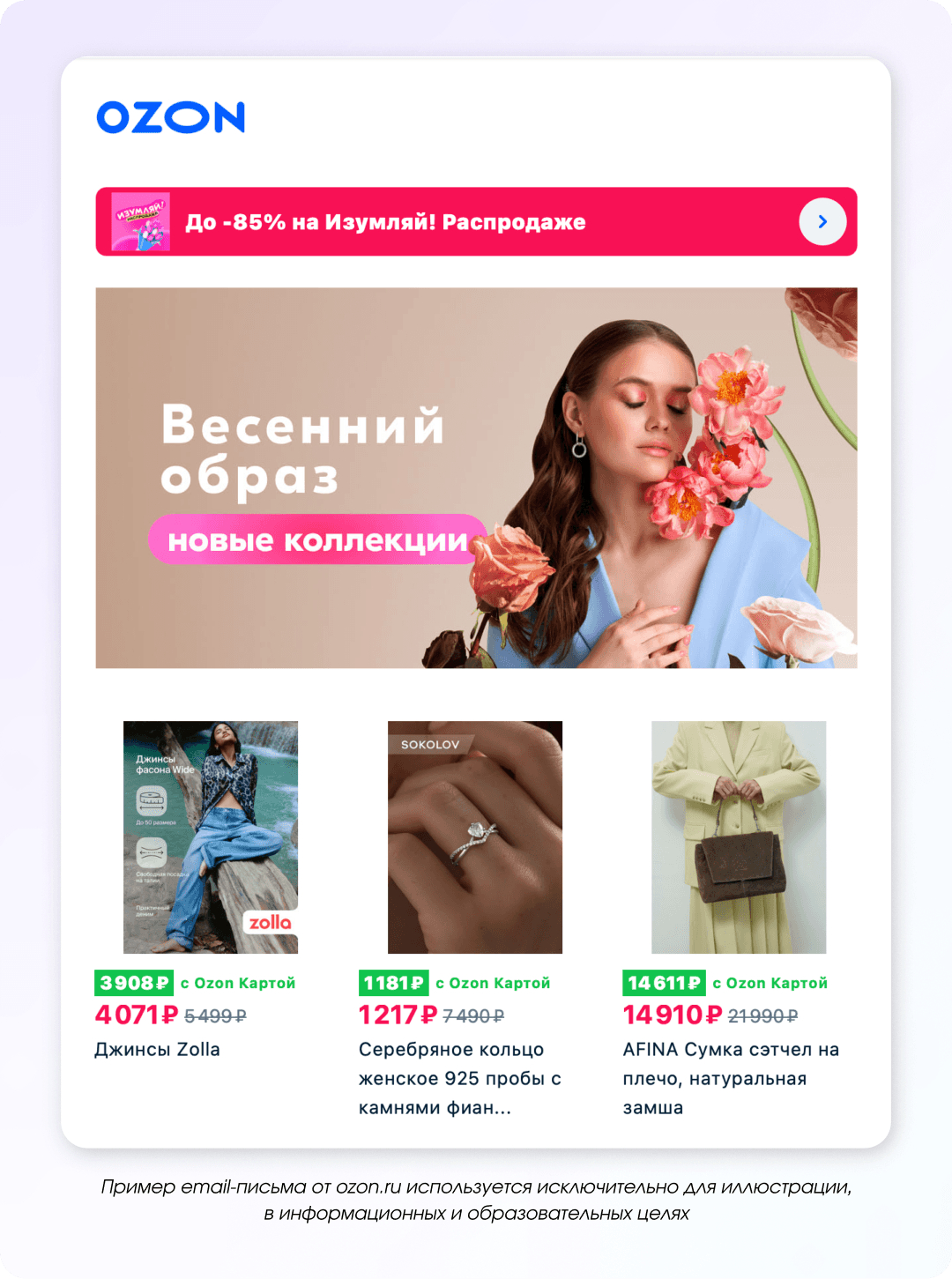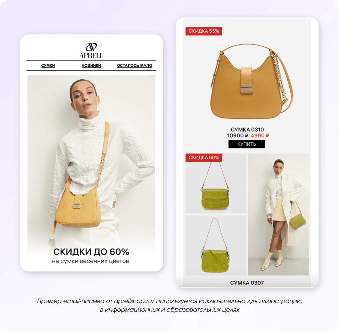 Например, бренд сумок сделал подборку моделей в «весенних» цветах и добавил на них скидки. Выглядит свежо, уместно и без шаблонных поздравлений.