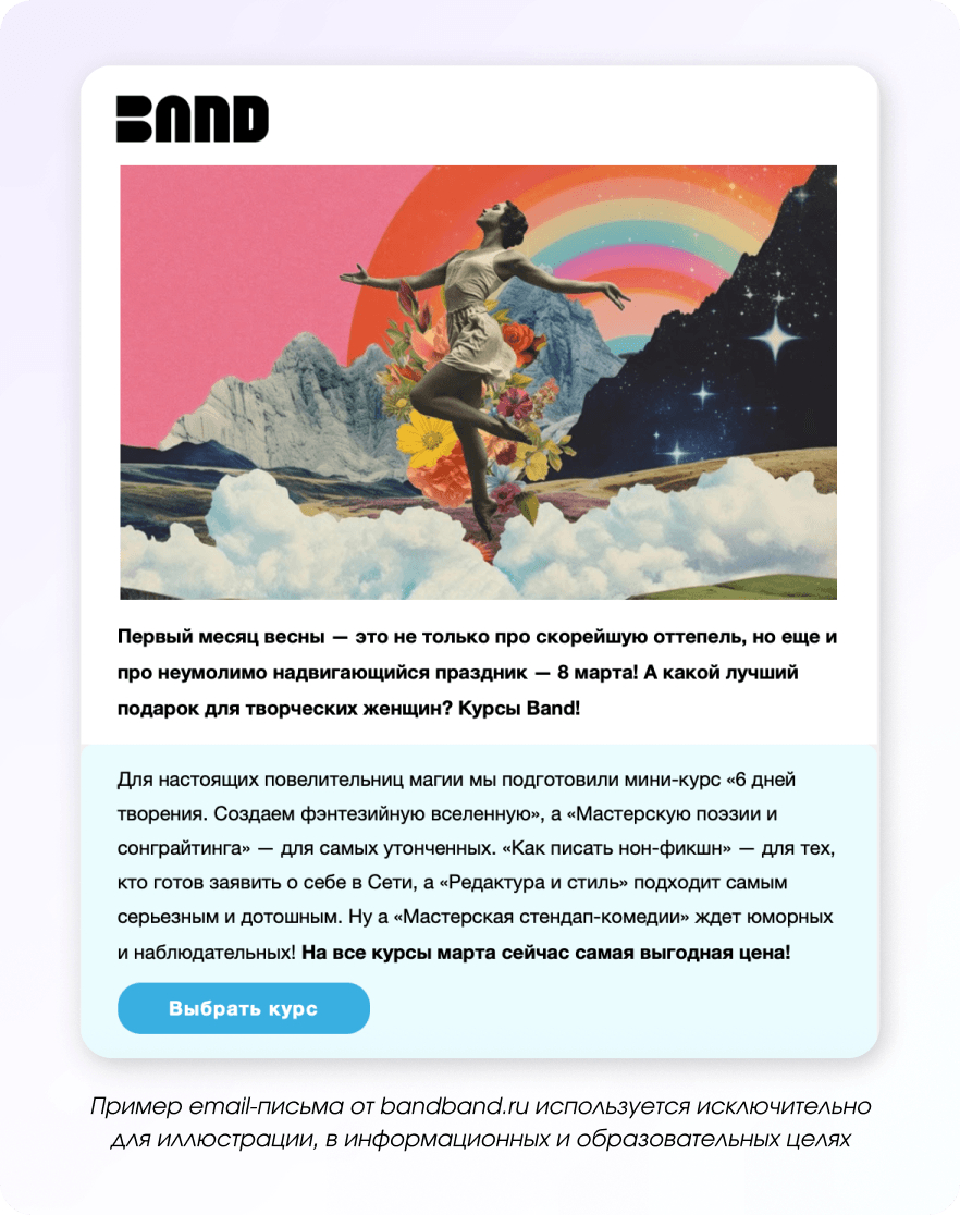 Сам праздник при этом можно не упоминать вовсе — просто отправить такую рассылку в этот день. Получается аккуратный, уместный контент без навязчивых поздравлений и офферов.