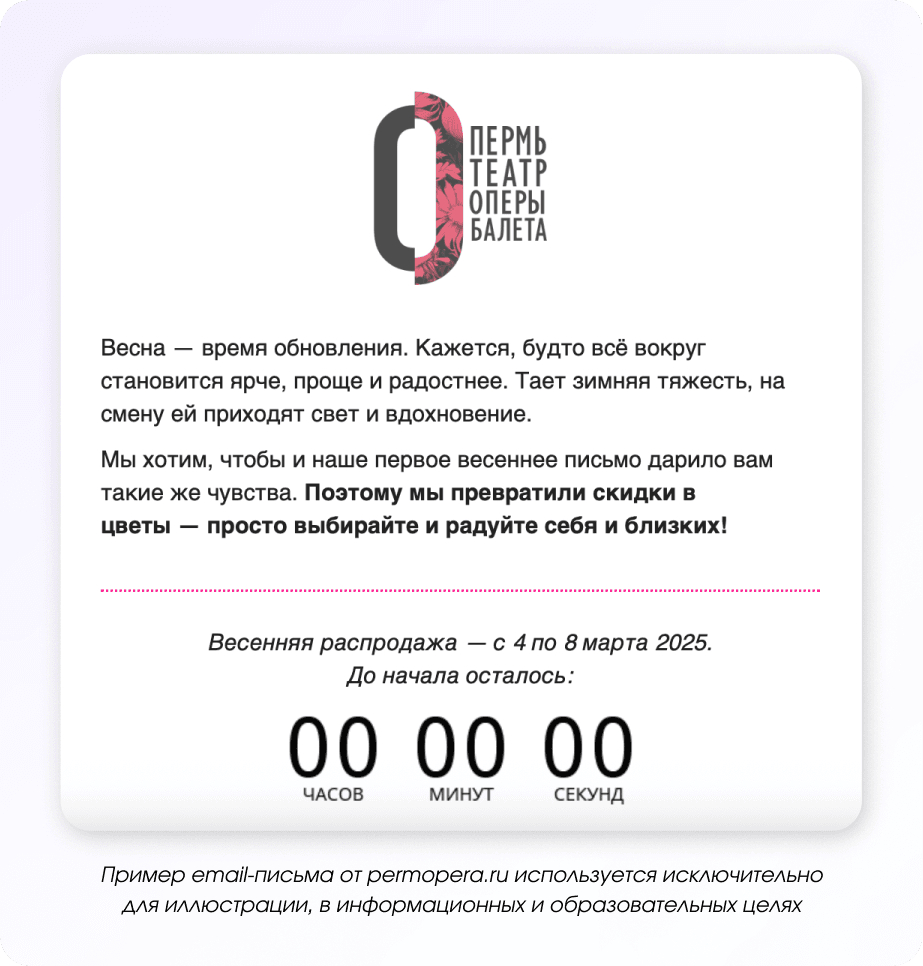 Праздничные рассылки подходят и для продвижения мероприятий. Например, театр запустил акцию со скидками на спектакли в дни перед 8 марта и рассказал об этом в письме.