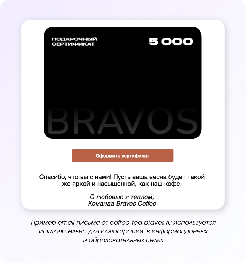 Кофейный бренд тоже предлагает подарочные сертификаты. Это удобный вариант для тех, кто не знает, что выбрать, или не успевает купить подарок заранее — можно быстро оформить и отправить получателю.