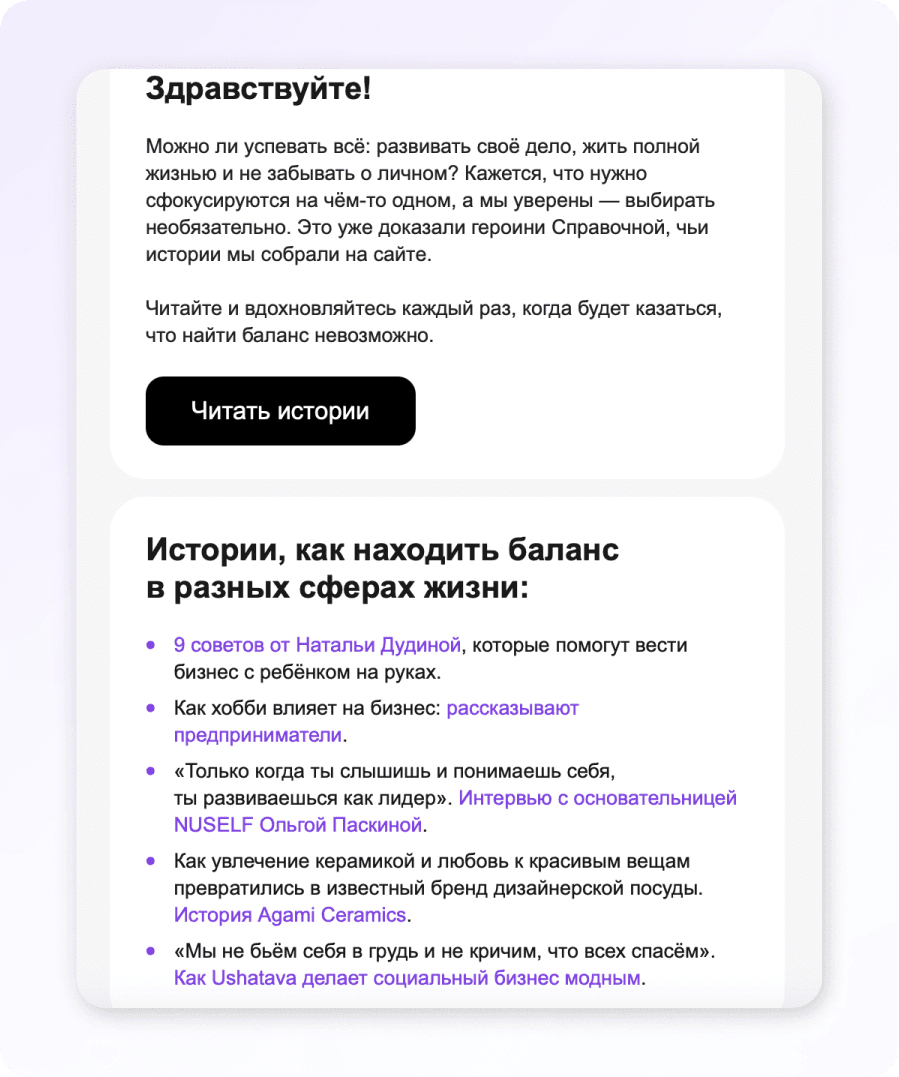 Это формат познавательных и имиджевых писем, где нет прямых продаж. Например, можно собрать истории женщин, их опыт и вдохновляющие кейсы.