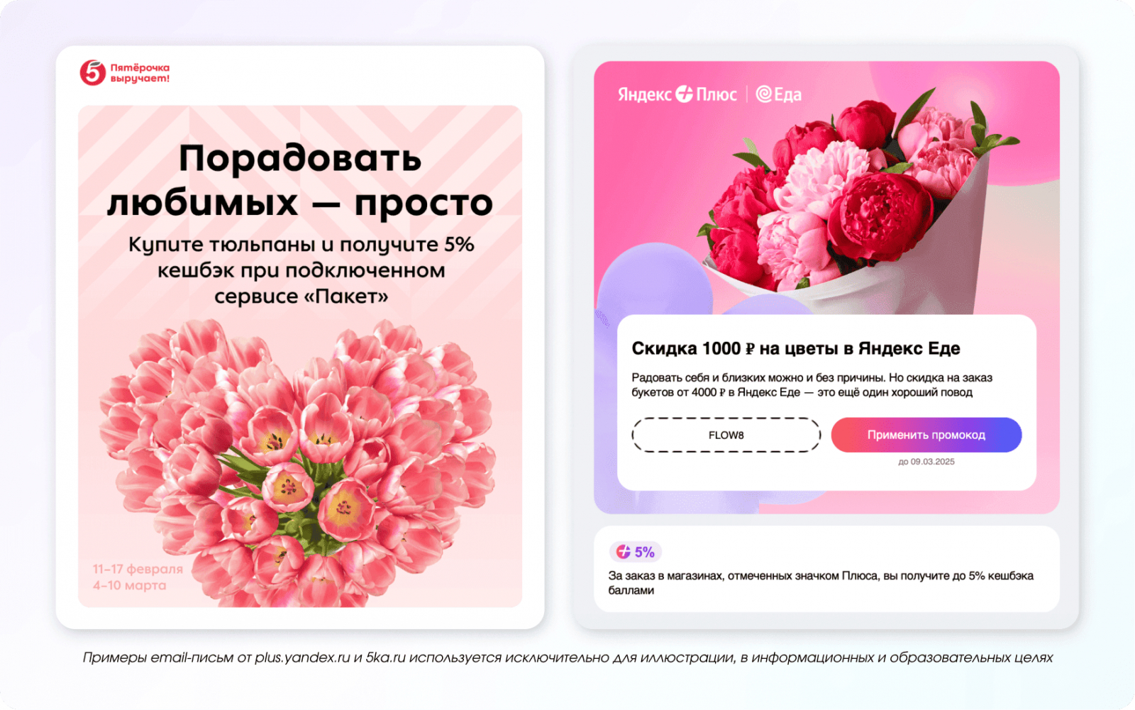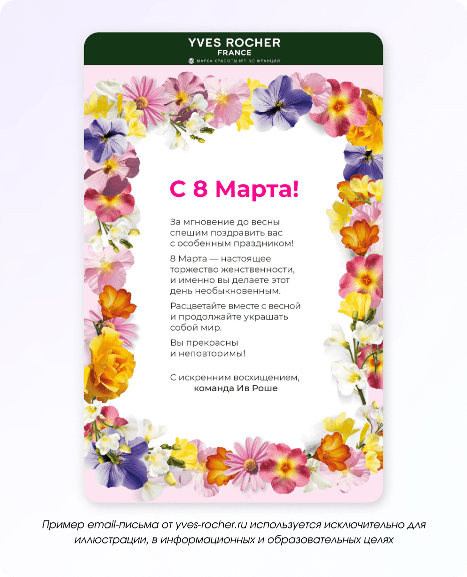 8 марта сложно представить без цветов, поэтому этот образ логично использовать и в коммуникациях. Цветочные мотивы можно добавить в оформление писем, а также предложить букеты, подарки или специальные скидки.