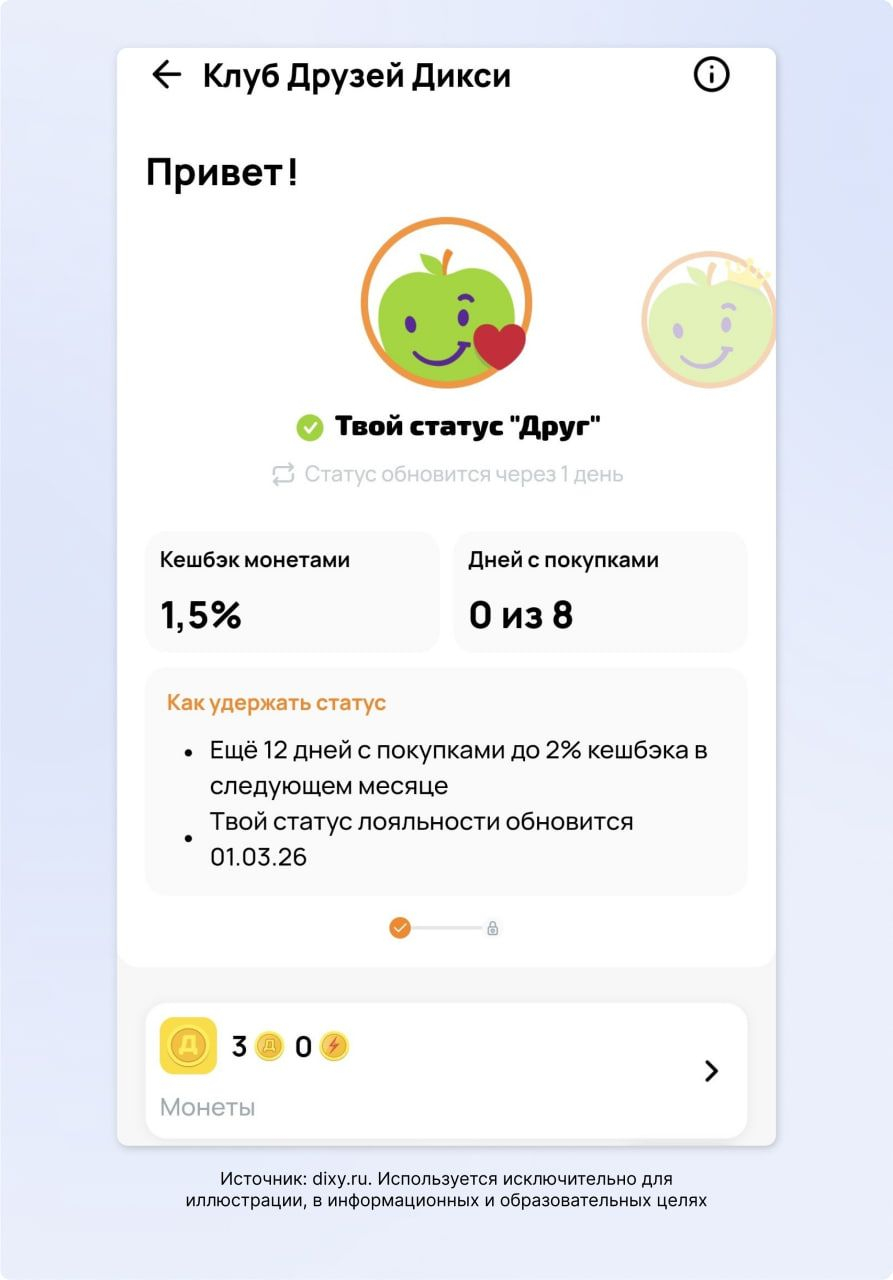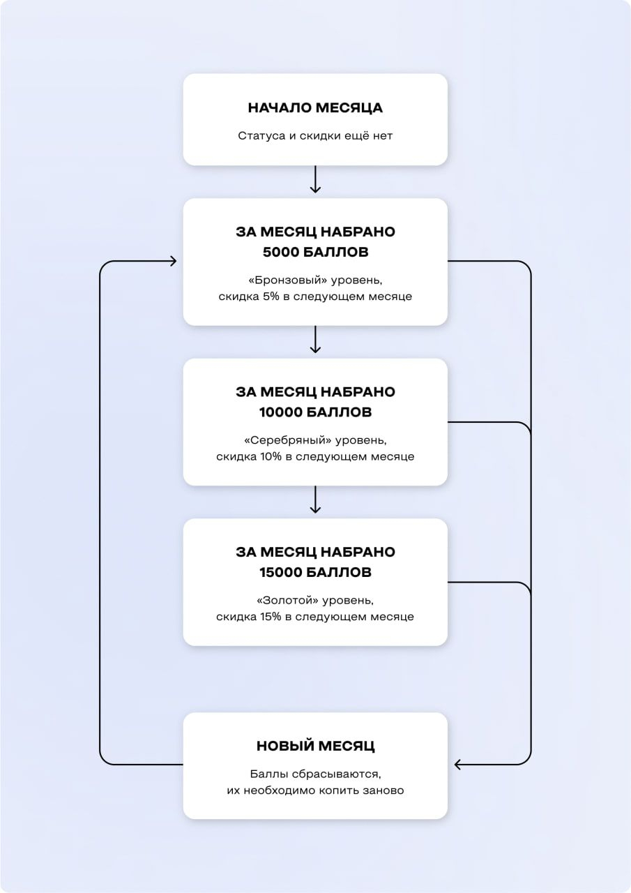 То есть, если за февраль клиент накопил 10 тыс. баллов, в марте он получает скидку 10% на покупки. Но чтобы скидка сохранялась в апреле, за март необходимо набрать требуемое число баллов, иначе статус и уровень скидки сбрасываются.