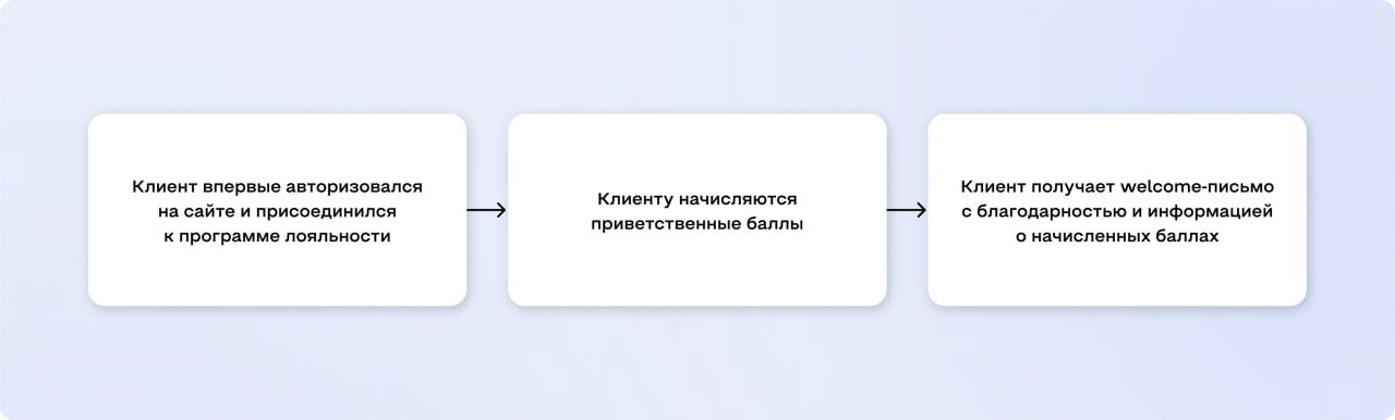 Пример: клиент впервые авторизуется на сайте и присоединяется к программе. За это ему автоматически начисляются приветственные баллы. После этого отправляется welcome-письмо, где указывается, в том числе, сумма баллов на счёте.