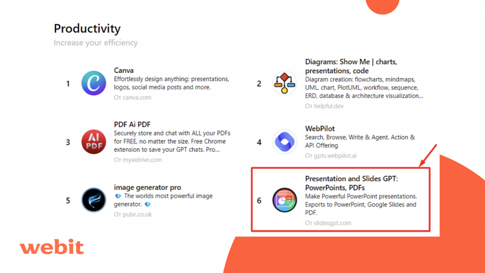 3) Presentation and Slides GPT: PowerPoints, PDFs — помогает создавать презентации. Правда изображения подбираются с фотостока, но их можно заменить на свои при необходимости. После генерации есть возможность скачать презентацию в формате Power Point, Google Slides, pdf.
