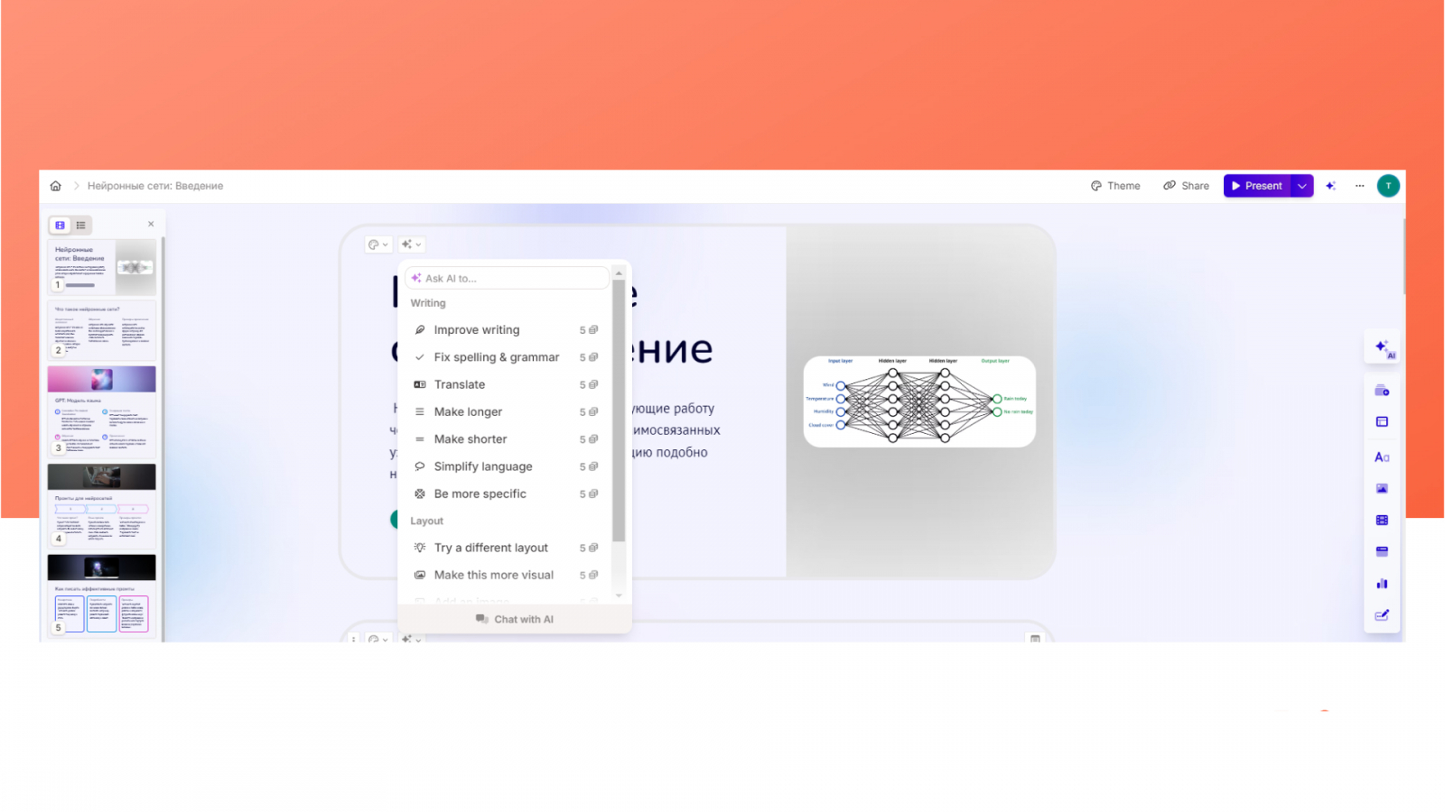 Но есть и отдельные сервисы, которые помогают создавать слайды. Например, Gamma.